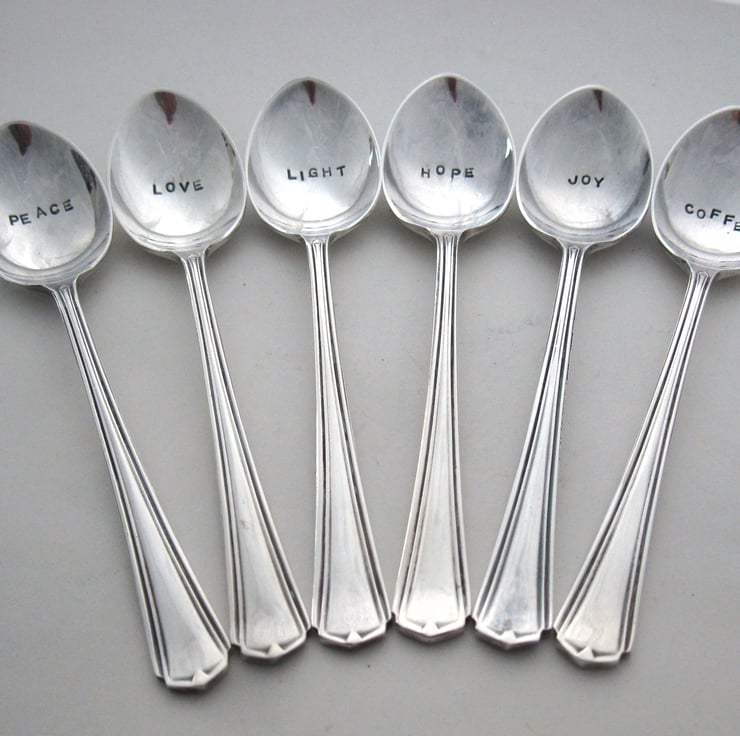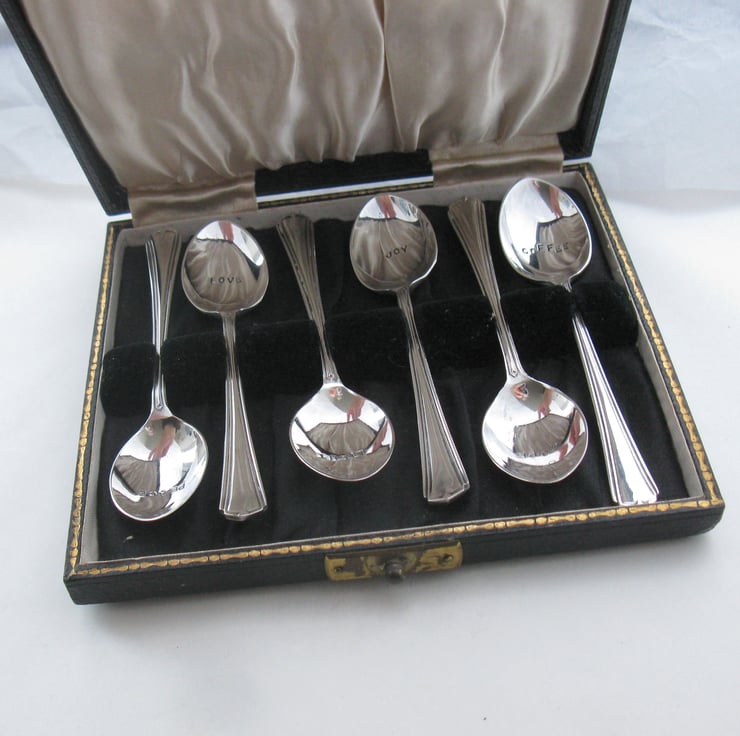 A matching set of six vintage silver-plated coffee spoons with art deco style handles, each handstamped in the bowl with a different festive blessing word: LOVE, LIGHT, PEACE, HOPE, JOY and of course COFFEE. I've put them in a vintage box (not definitely their original box) with a textured black exterior and foil detailing. Both box and spoons are a little bit old and battered albeit still in very good nick for their age. And after all, this is a bit of fun rather than top-of-the-range tableware!