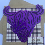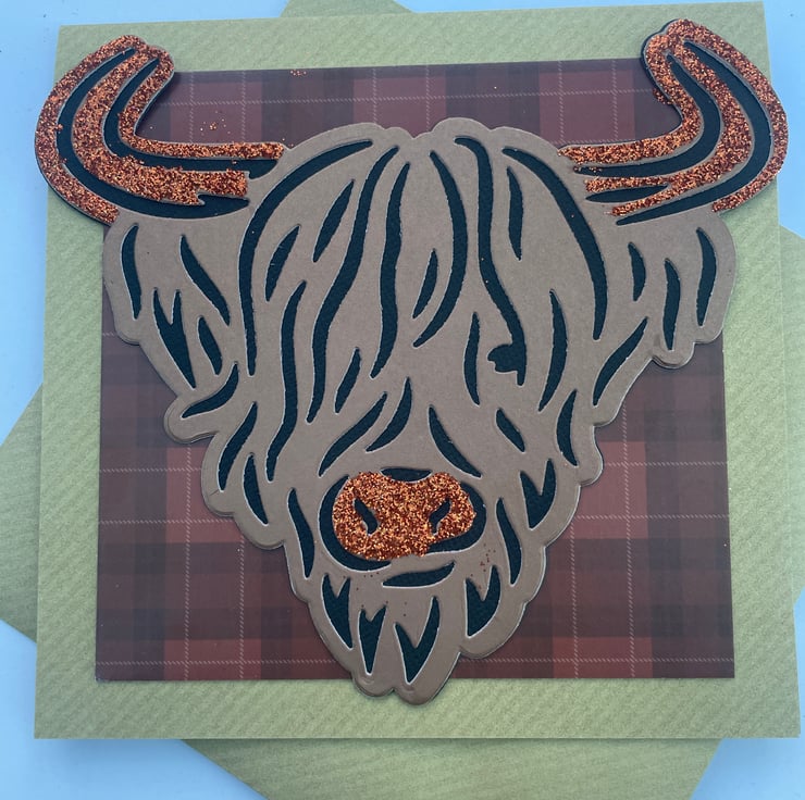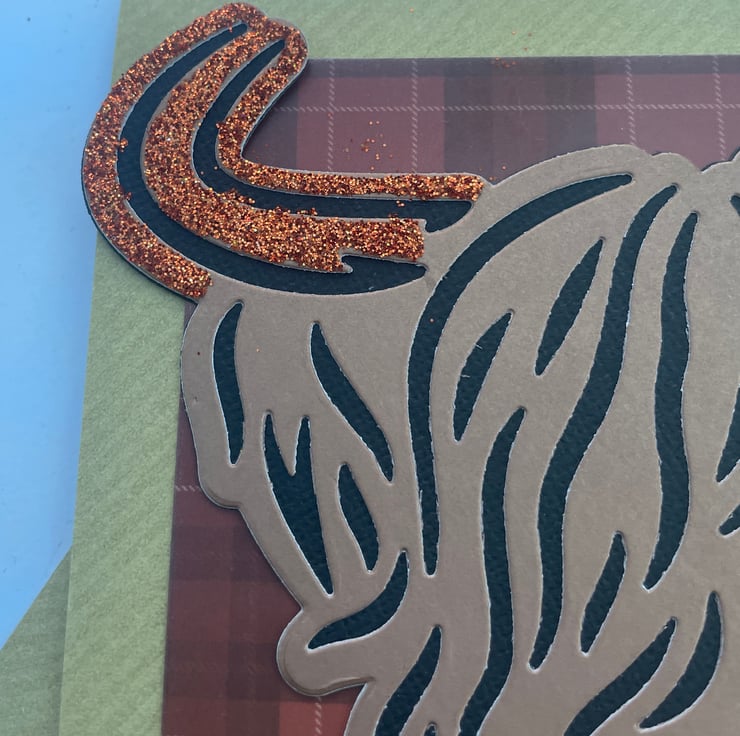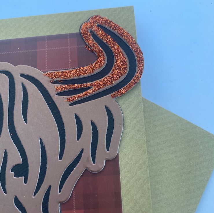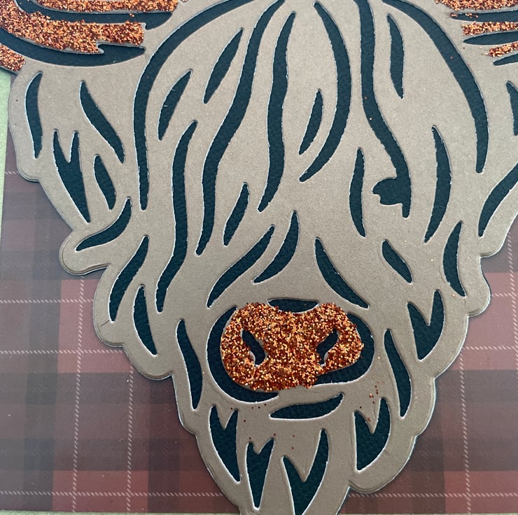 A little Scottish inspiration for this Christmas card. This 12.5x12.5cm card has a Kraft card base. This has a tartan card decorating it. This is topped with a die cut image of a Highland cows head. The background is black card and the upper is a metallic bronze card. This is embellished with copper glitter on the horns and nose. Something a little different to celebrate Christmas. Inside the card has the greeting Merry Christmas. Very Scottish but for anyone who loves those Highland Moos.