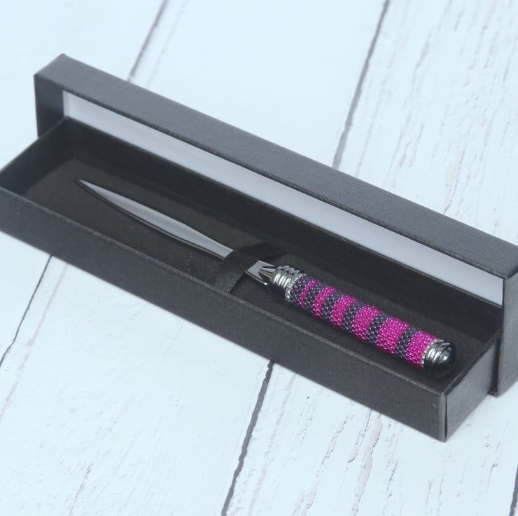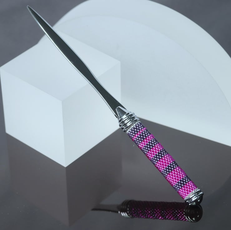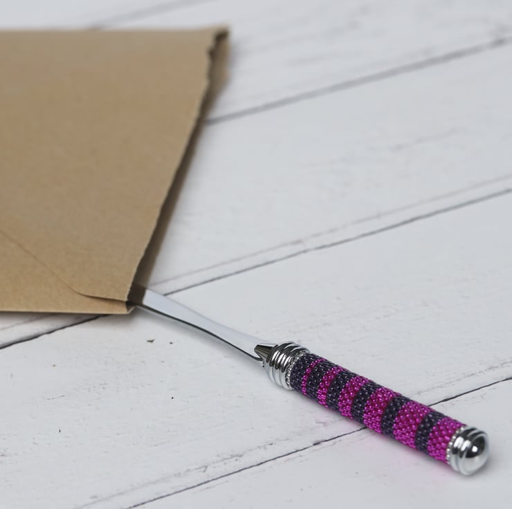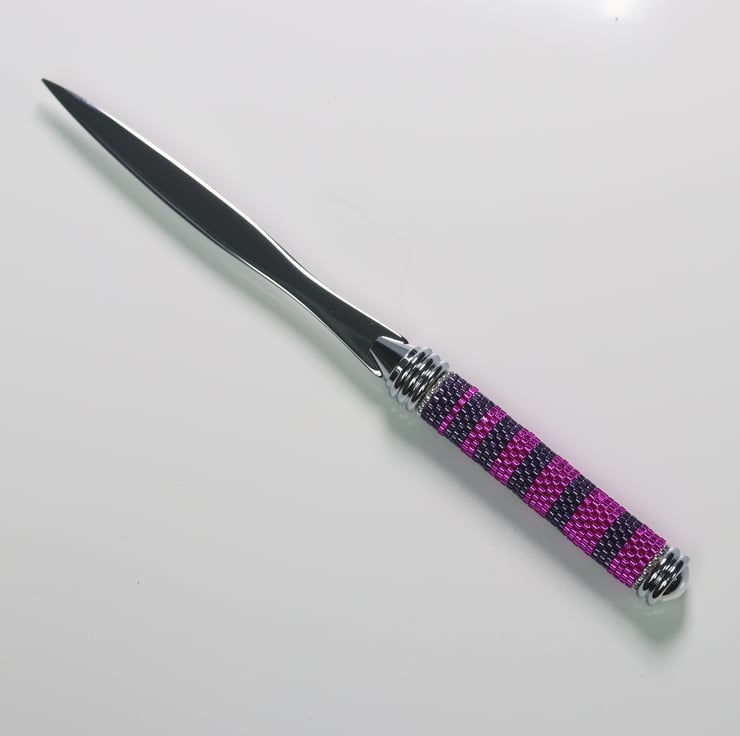 A pretty silver coloured letter opener in an elegant style: with a beaded handle in fuchsia and purple.