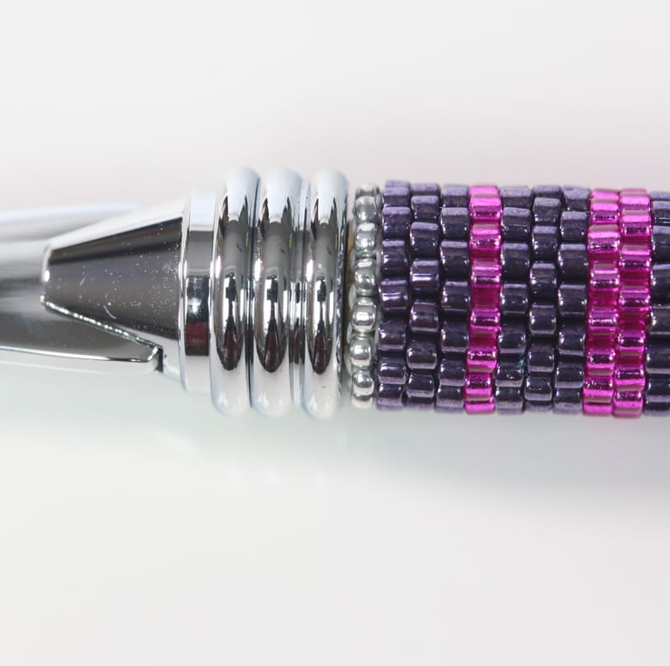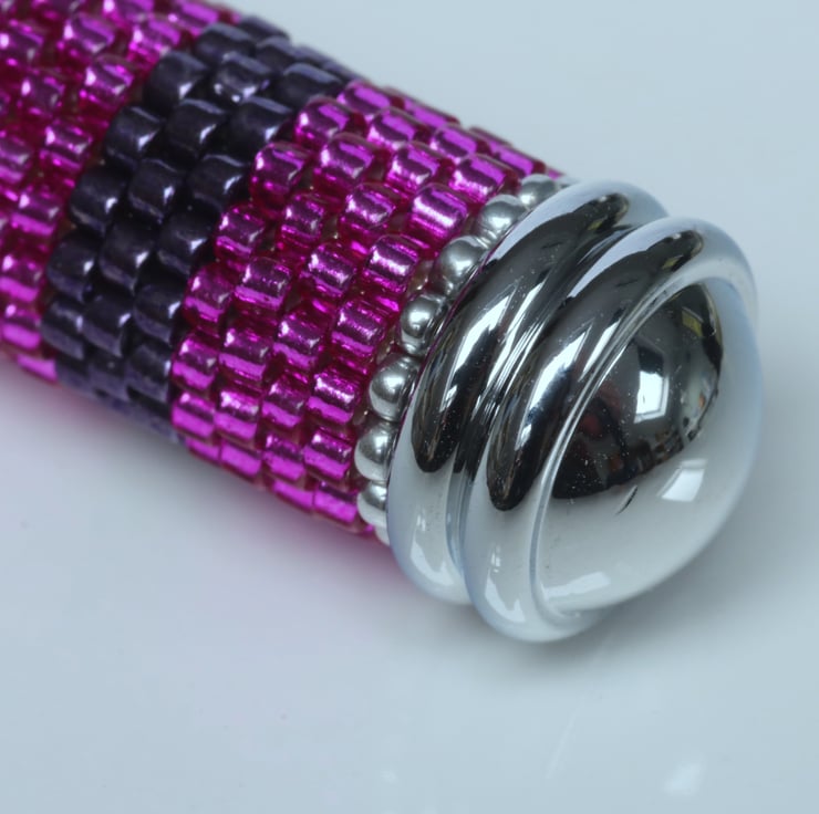 I have made the surround for the handle using a process called beadweaving, by which the beads are sewn together by strong beading thread (not unlike fishing line). I have used pretty delica (seed) beads in a dark purple colour and a bright silver-lined fuchsia. .