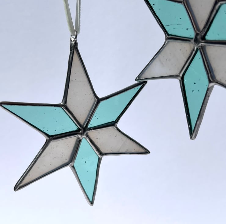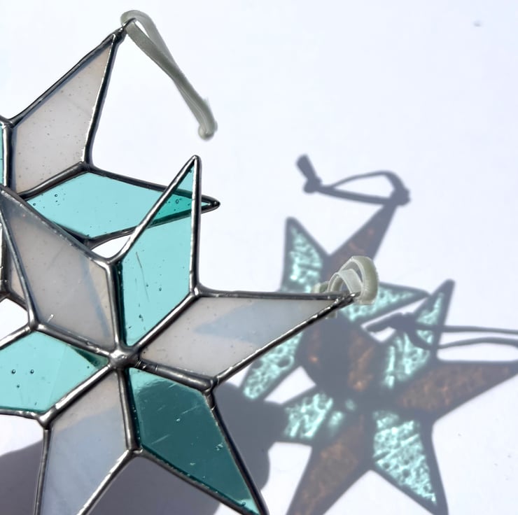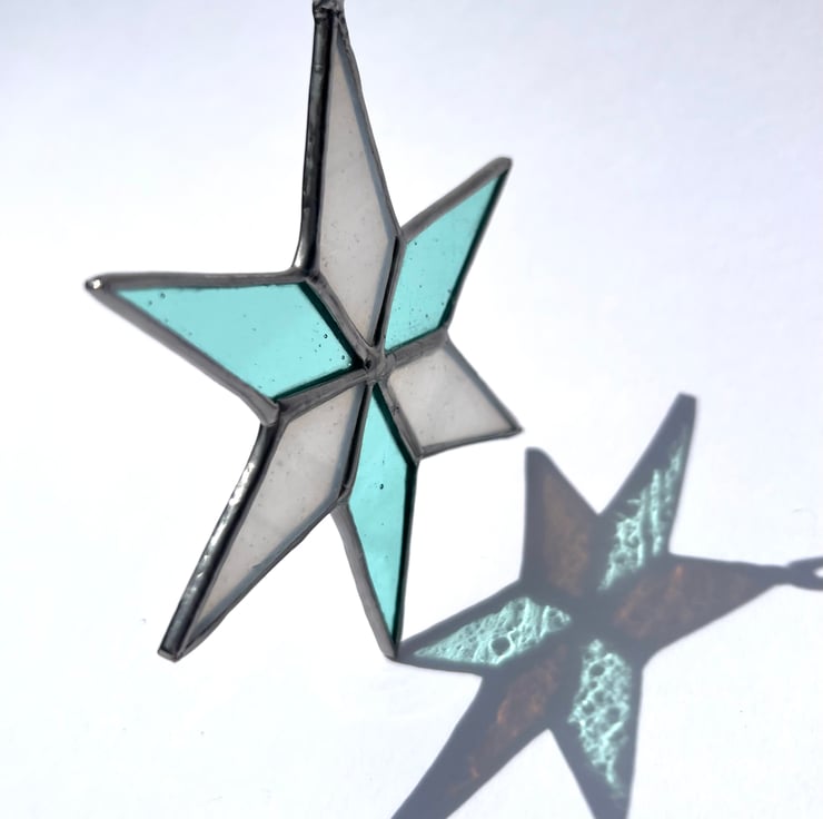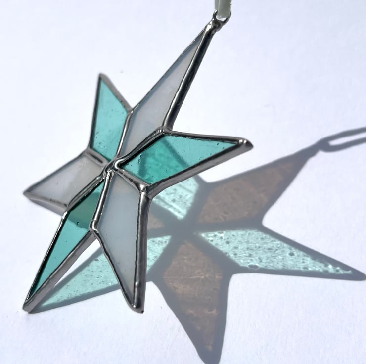 A pretty stained glass Christmas star decoration in a pale blue-green and wispy white glass.