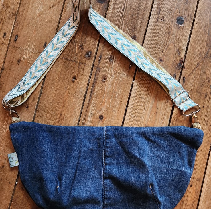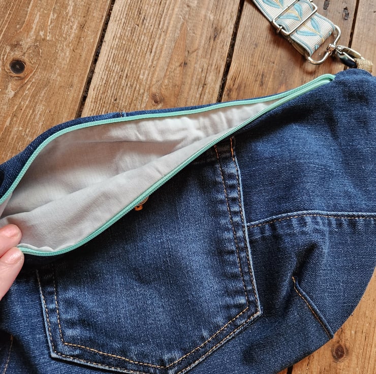 Meet the bag that’s as original as you are. Once a pair of jeans, now a one-off denim bum bag with vintage attitude and everyday function. Beautiful pale green zip top opening and front pocket with stud button meaning you have style as well as plenty of storage. The adjustable strap allows you to wear it crossbody, around your waist, or over your shoulder to suit you as well as the occasion. Handmade from reclaimed denim, no two bags are ever the same.