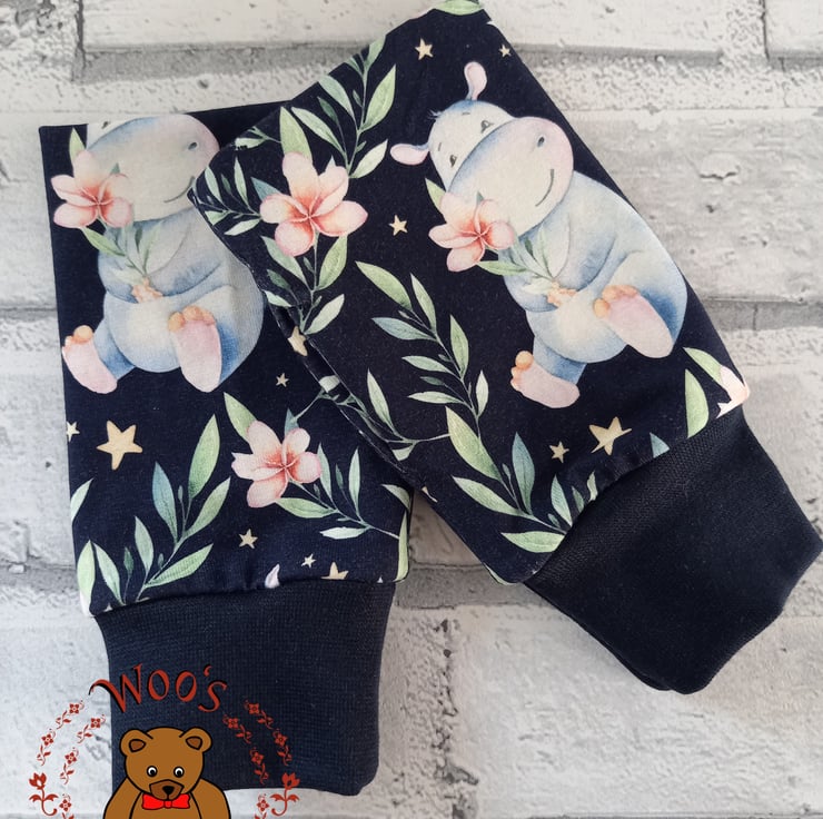 Made from a georgeous Hippo themed super soft cotton jersey and fully lined with a matching plain navy rib knit cuff.