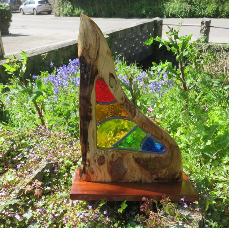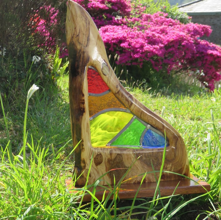 This is Parvos. She's a unique, handmade gorgeous little sculpture made from a stunning piece of spalted Elm which is mounted on a Sapele hardwood base, and is intended for indoor display, on a windowsill or anywhere that gets plenty of light. We do nothing but make quality wood and stained glass creations for indoors and outdoors. Perfect for Xmas, Birthdays, Anniversaries, Weddings, whatever!