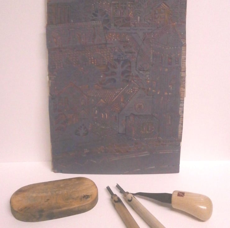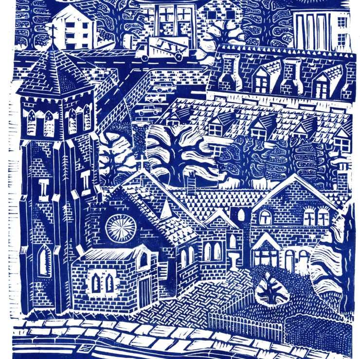 Woodcut print, 'View Over St Francis Church', Bedworth by John Freeman