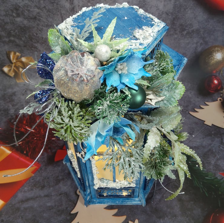 Bring a touch of winter magic to your home with this handcrafted decorative lantern, beautifully designed in shades of deep blue and frosty green.