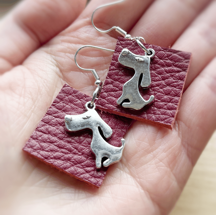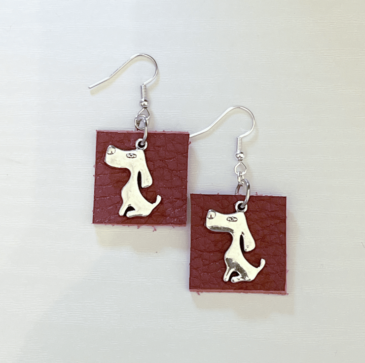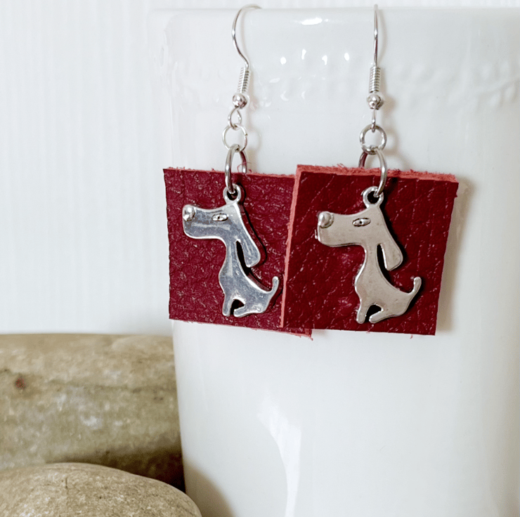 Elegant Red Leather drop Earrings with silver cheeky Dog Charm