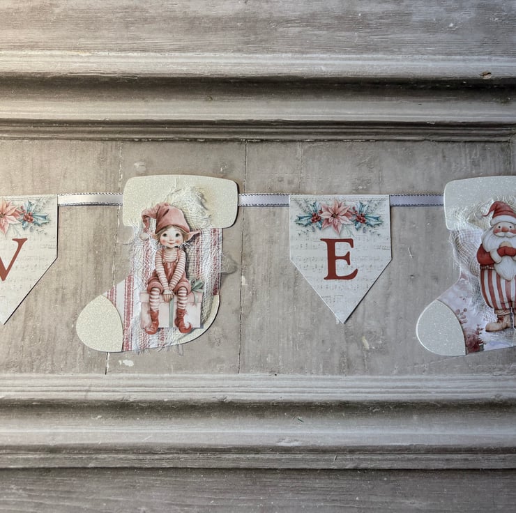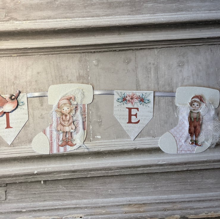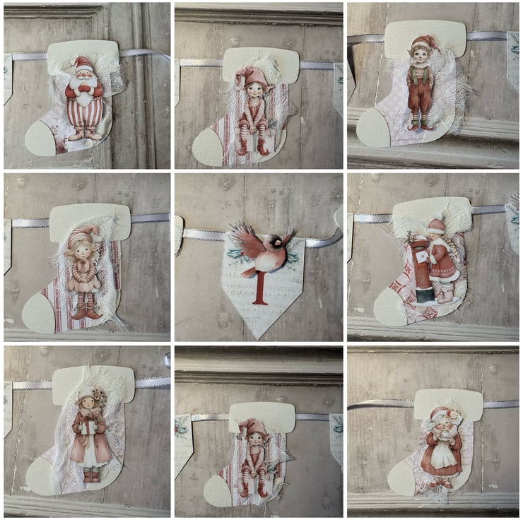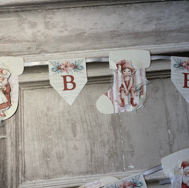 Fun Christmas Stocking and Pennant Banner attached to white satin ribbon with a silver edge. Measuring approx 80" long. This banner has 8 stockings in pretty pairs with a glitter top, heel and toe detail. Cheesecloth added with the pretty image of Santa, Mrs Claus, Winter Girls and Elves. 'Believe' wording added in between the stockings. The middle letter has a cute cardinal sitting on top of the letter I. A pretty addition to your Christmas Decor.