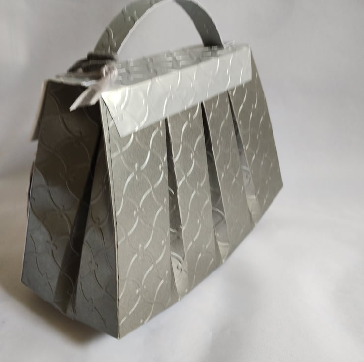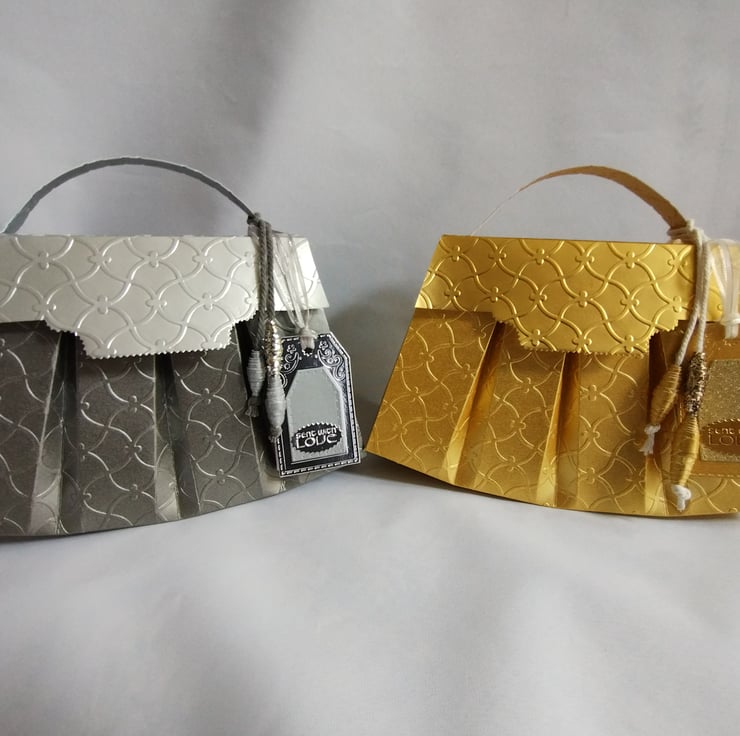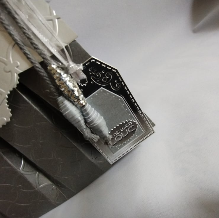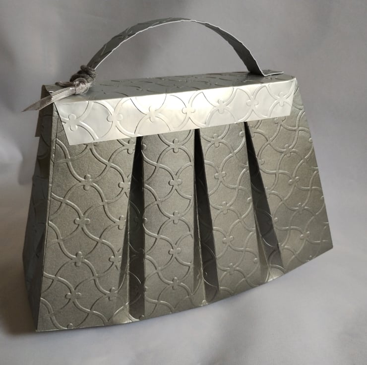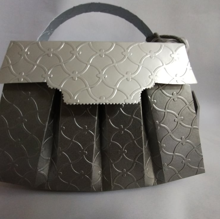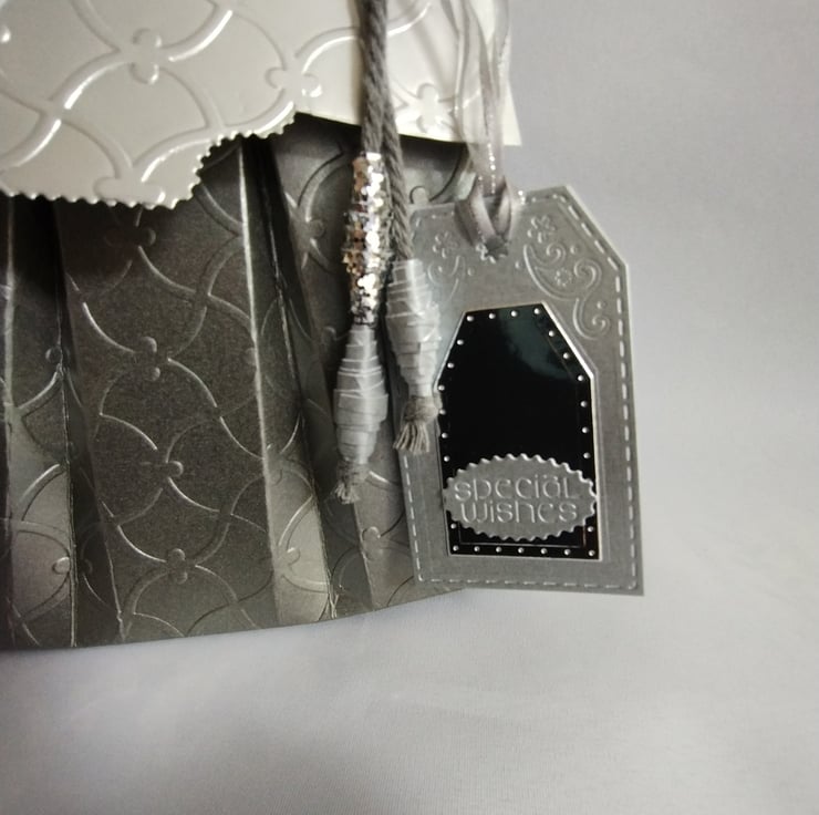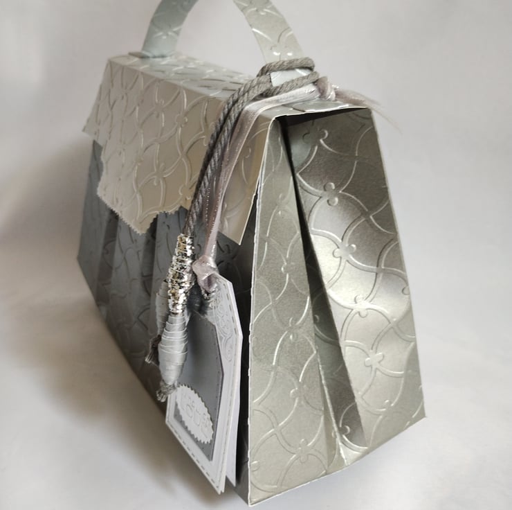 I've made this fabulous super shiny handbag style gift bag from premium two tone pearl finish silver cardstock which I have embossed with a curly trellis pattern. Detail is added with three pleats or fanfolds to the front and back and a pleat or fanfold to the sides. The front flap is made from a lighter shade of silver platinum cardstock and fastens with hook and loop dots (Velcro type). It has matching paper beads, tied with thick silver grey twine. The tags, for you to write your message, are tied with beautiful cream and silver satin edged organza ribbon with a line of silver thread. The tags also have embossed oval details; "sent with love" and "special wishes"