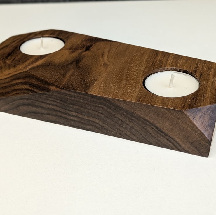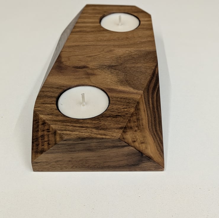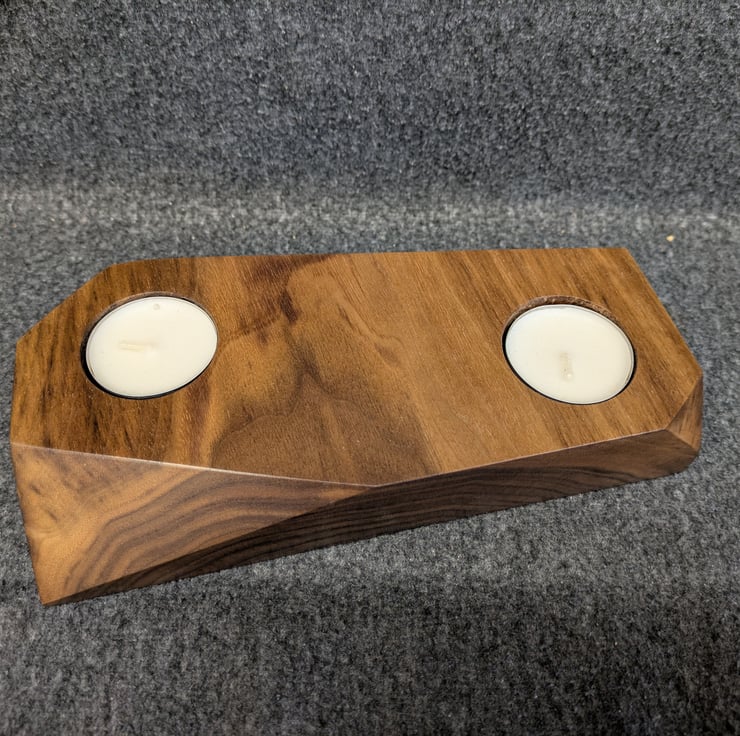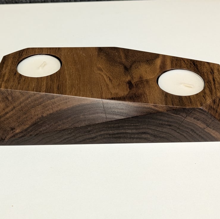 Up cycle English walnut teelight holder finished with danish oil and clear beeswax.