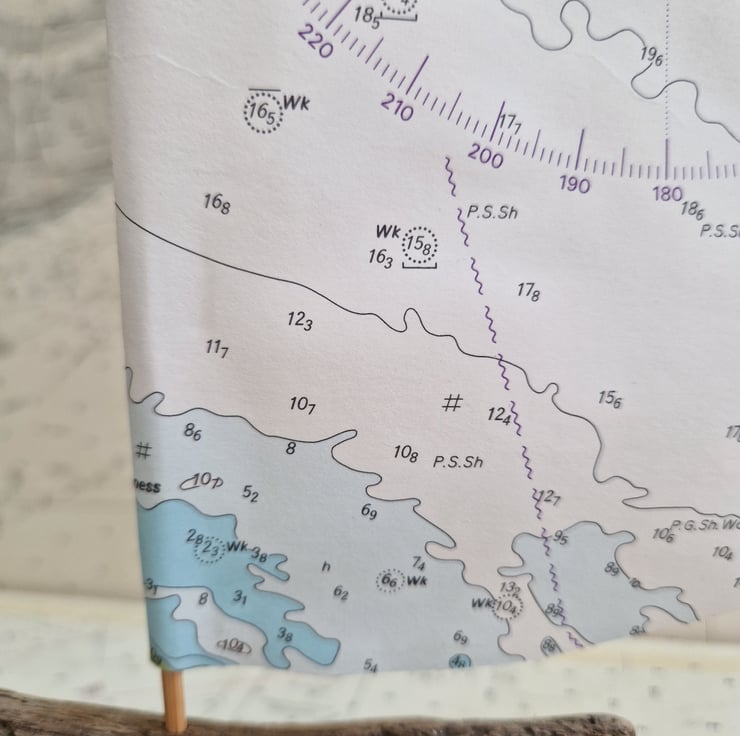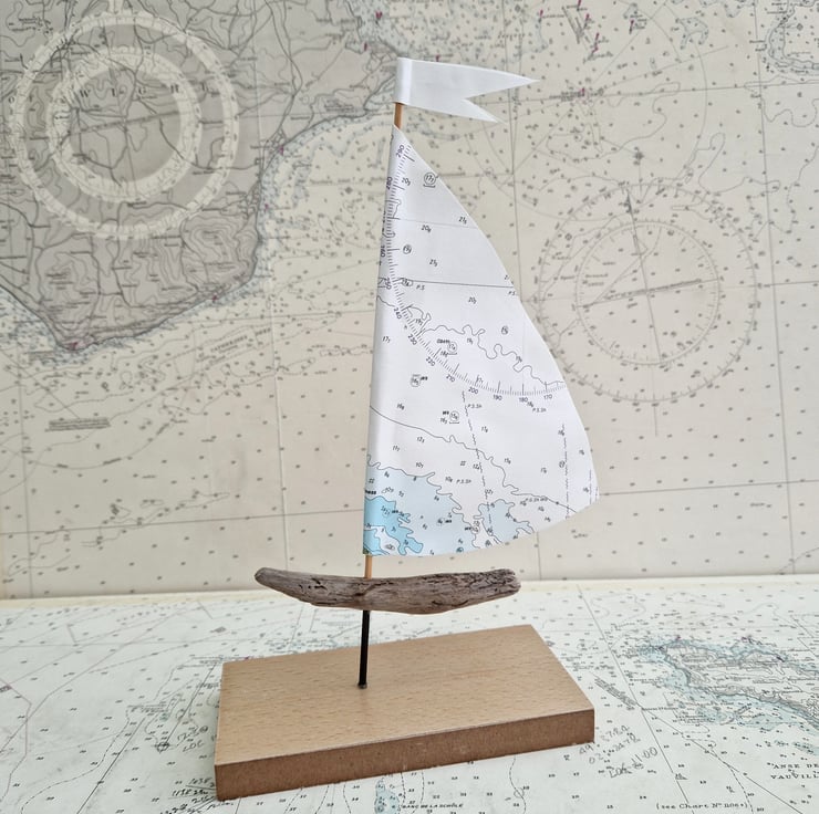 Sails are made from authentic repurposed nautical maps which have been used on voyages around the British Isles, and some may have small handwritten annotations: please check the images to view.