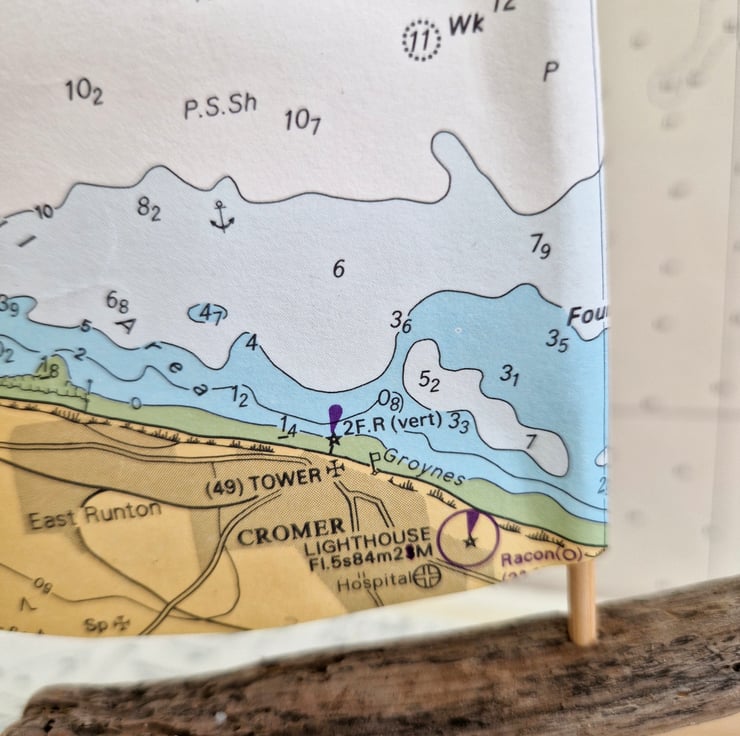 Norfolk - Cromer, Sheringham driftwood sailboat, repurposed nautical map sail