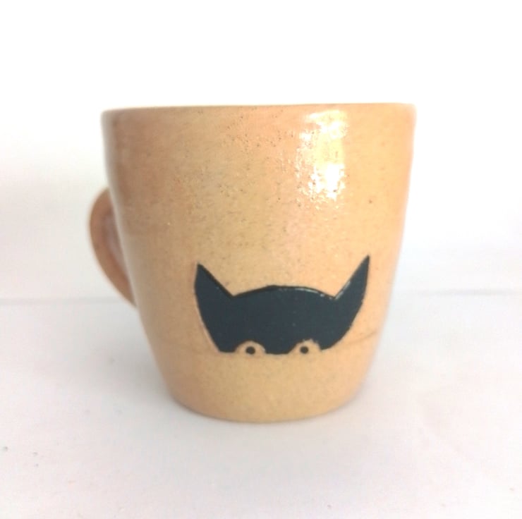A Ceramic Cat mug made by Penarth Ceramics from white stoneware clay. Thrown on the Potters wheel and decorated with a humerous black Cat face peeking. Hand painted in black. Suits hot or cold drinks. Microwave and dishwasher safe. Finished in a clear leadless glaze, to retain the natural fired color of the clay. Measures 8 cms high x 8.2cms wide at the rim. Capacity is 275 mls. Great gift for a cat lover.