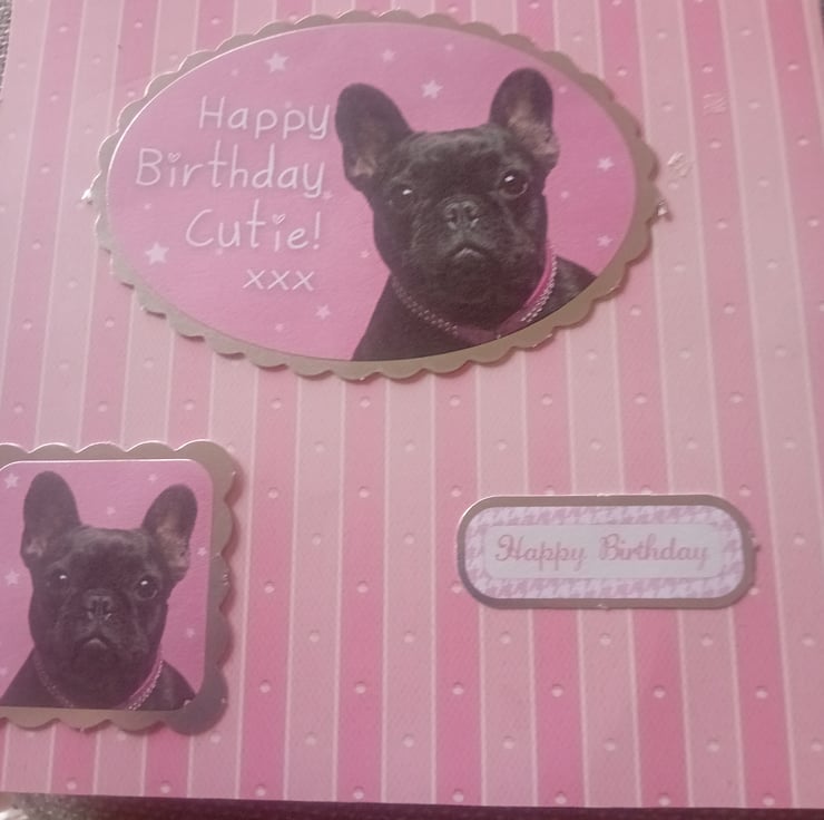 8-inch square card with envelope. Pink background with a shaped dog embellishment with a silver frame. The larger image has a cute little dog with a message Happy Birthday, Cutie with xx kisses. matching the dog image in a smaller frame and a happy birthday greeting. lovely big card comes wrapped in cellophane for protection