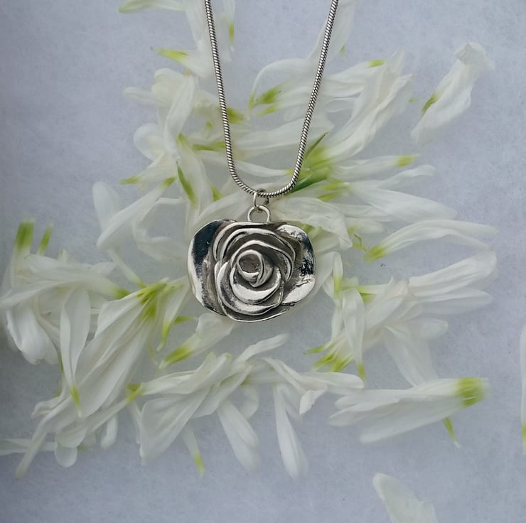 A beautiful silver rose necklace inspired by nature. Each petal has been individually hand crafted then joined to make a silver rose . The approximate dimension of this piece is 1.4cm wide and 1.4cm long.