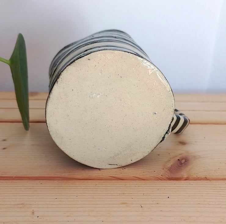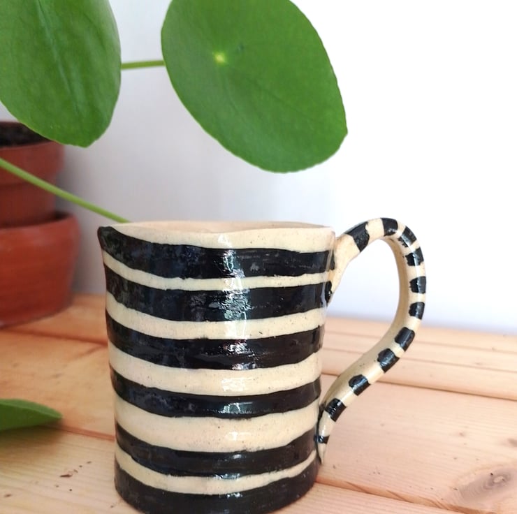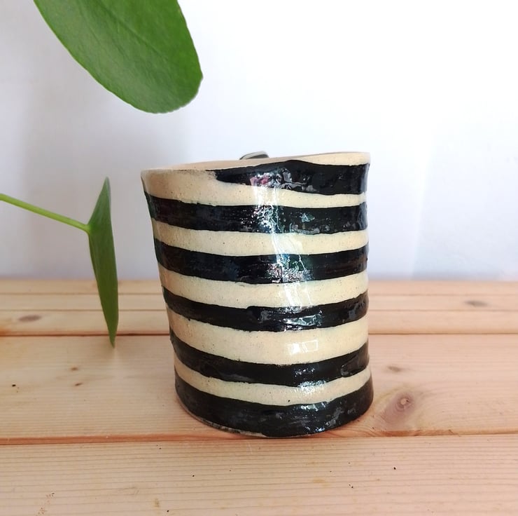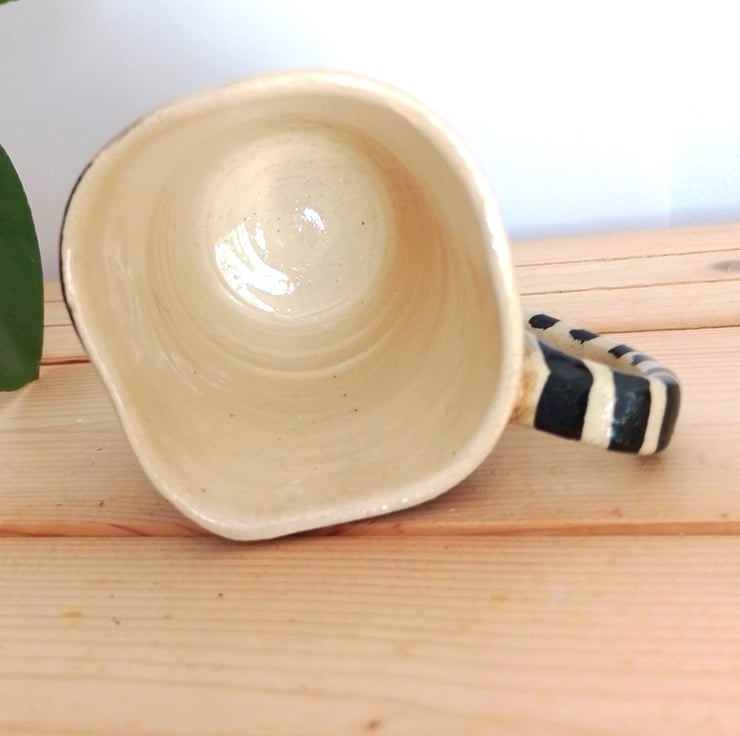A quirky, wonky novelty mug made from white stoneware clay. Suitable for hot or cold drinks. Decorated with black stripes, on an ivory natural clay color. The mug was made dliberately wonky as a humerous idea. The profile is wonky and so is the rim. The handle has also been hand painted with black stripes. Useable for serving, potentially keeps drinks hotter or cooler for longer,or could be used for decorative purposes. Finished in a glossy glaze. Stands approximately 8 cms x 7.5 cms rim. Capacity 200 mls