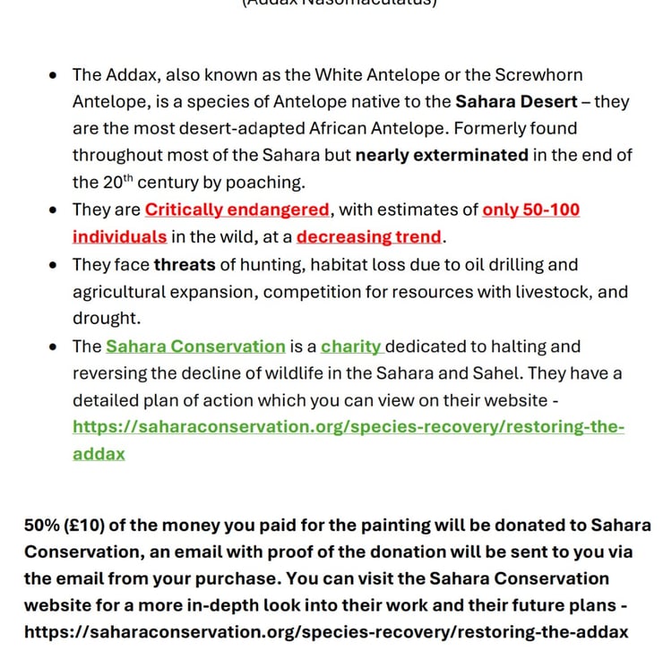 50% of your payment will be donated straight to the charity, Sahara Conservation, and I will email you proof of donation via the email used for the purchase.