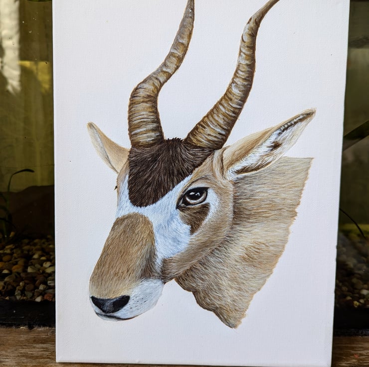 This acrylic painting on a 9" x 12" canvas depicts a portrait of the Addax, a critically endangered African Antelope, please see the third image for more personal information on the Addax, or visit the charity website Saharaconservation.org to learn more about their conservation efforts for the animals.