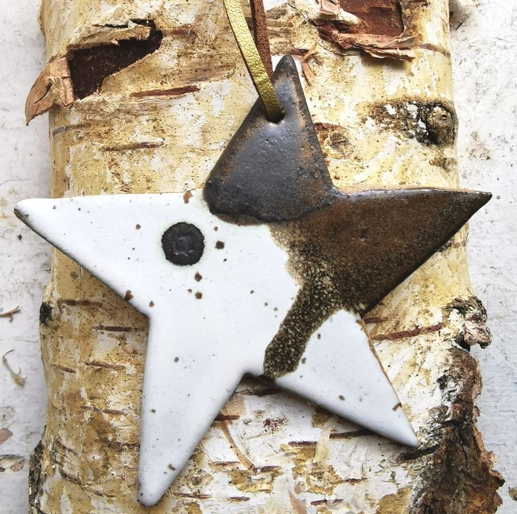 This listing is for a dancing star ceramic decoration. Each one is hand cut from lavafleck speckled stoneware clay, fired and then glazed with loose splashes of glazes in neutral, natural tones. Soft satin white, glossy tenmoku and metallic gold glaze with rich copper tones. Every one is unique, with a different orientation and glaze brushstrokes. Wonderful for all year round decoration or for the Christmas tree. Moons are available in a separate listing.