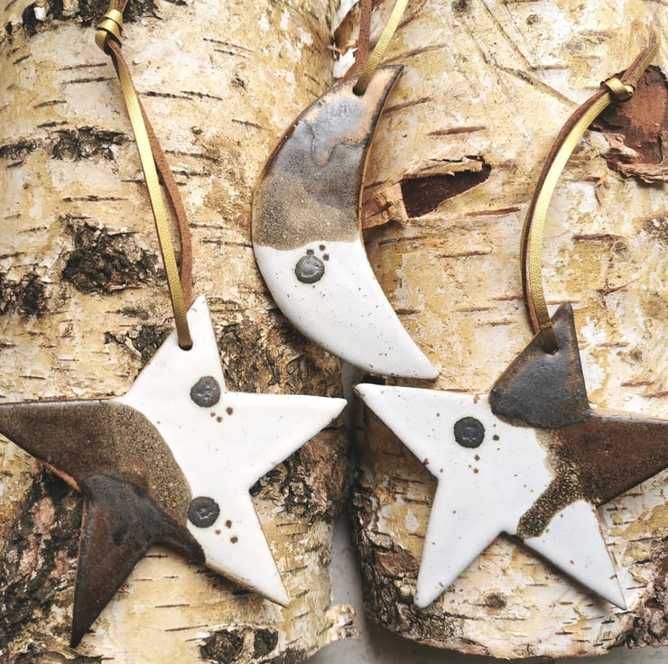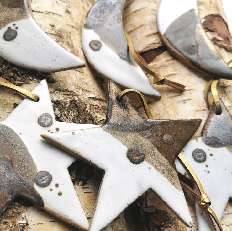 This listing is for a crescent moon ceramic decoration. Each one is hand cut from lavafleck speckled stoneware clay, fired and then glazed with loose splashes of glazes in neutral, natural tones. Soft satin white, glossy tenmoku and metallic gold glaze with rich copper tones. Every moon is unique, with varying orientations and glaze brushstrokes. Wonderful for all year round decoration or for the Christmas tree. Stars are available in a separate listing.