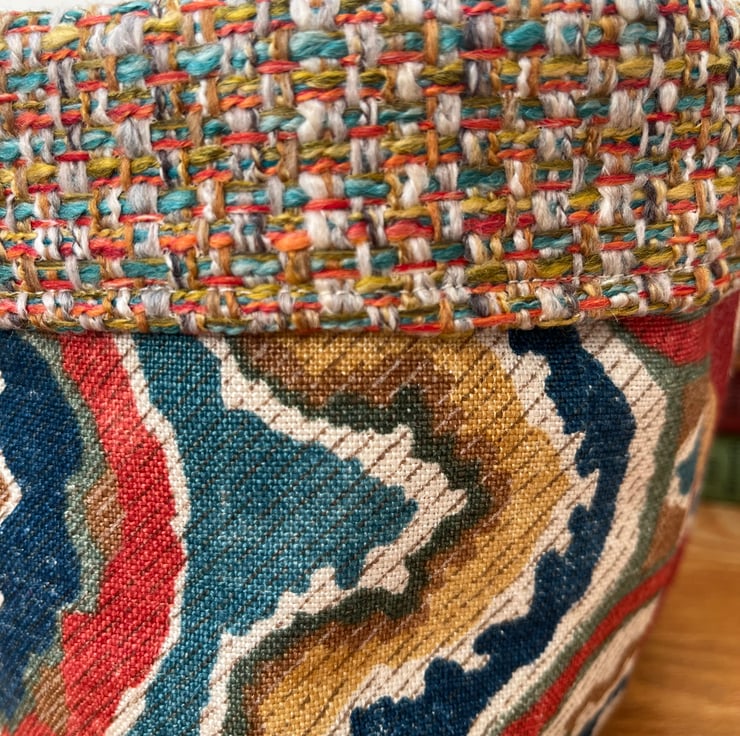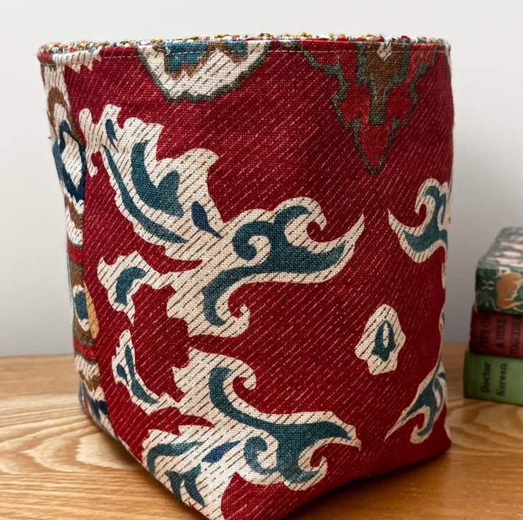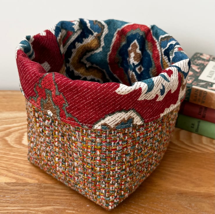 Reversible storage basket made from bright red and teal linen and thick woven orange blue and yellow upholstery fabric. A layer of interfacing between the layers makes it sturdy. Can be used with a turn-down to make the most of the contrasting fabrics.