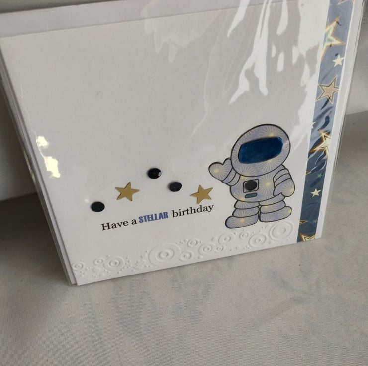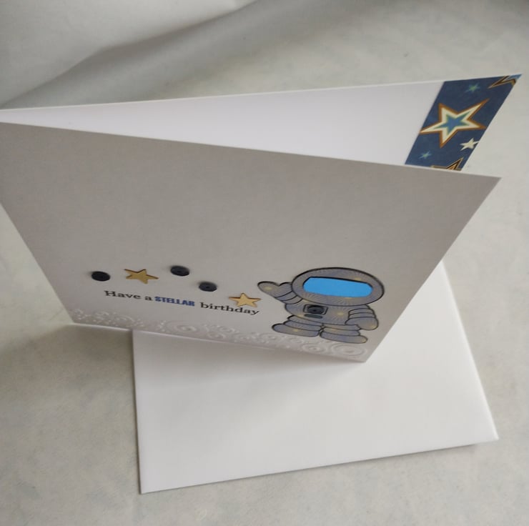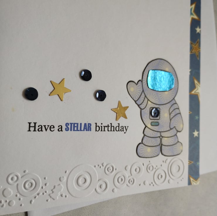 An paper-pieced astronaut with a shiny visor is the star of this card. I've embossed a circular pattern along the bottom and added sequins and gold stars for added detail. I've also edged the inside of the card with star patterned paper.