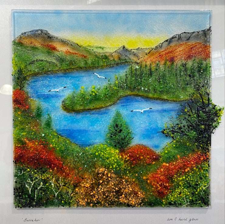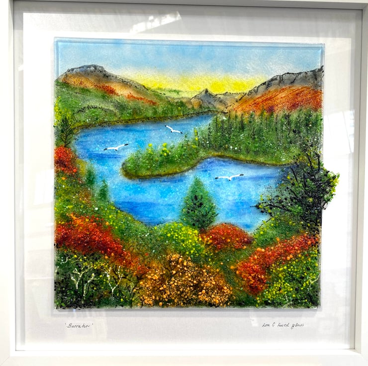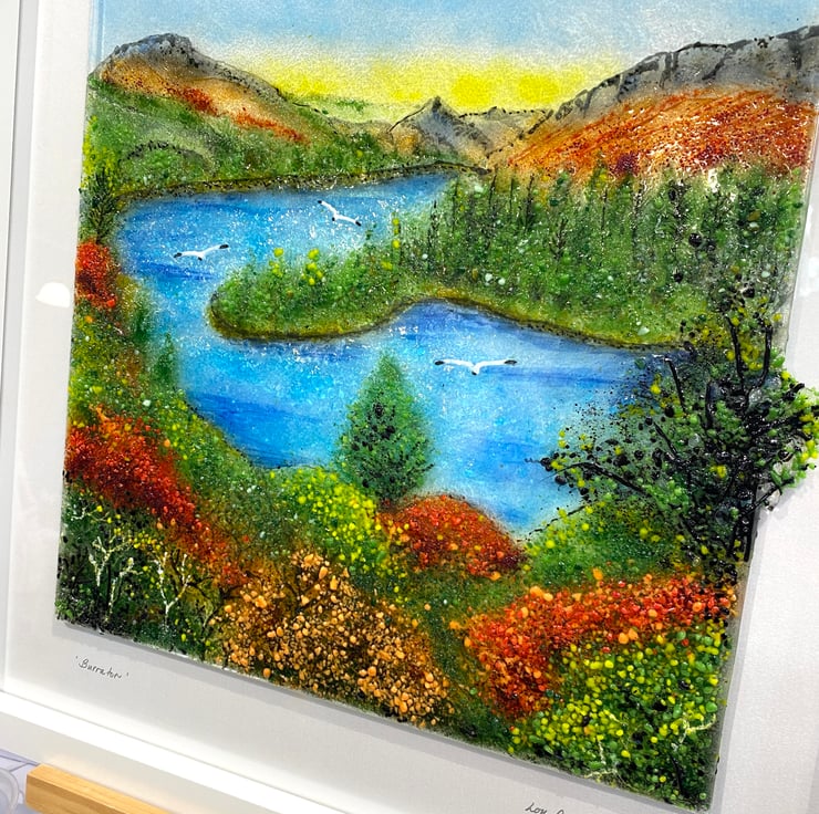Gorgeous interpretation of barrator on Dartmoor in Devon . Created with many layers of fused glass to create texture and depth . I use glass sheet, powder and frit ( crushed glass) . The landscape is then fired in the kiln many times before being mounted. The final size with frame is 40 cm square interpretation. The picture is professionally strung and ready to hang .