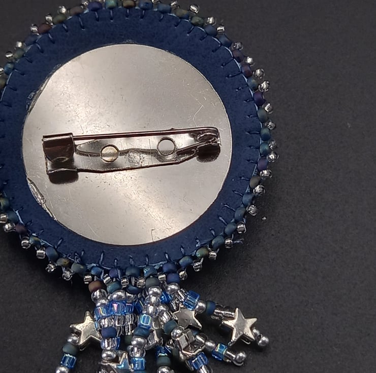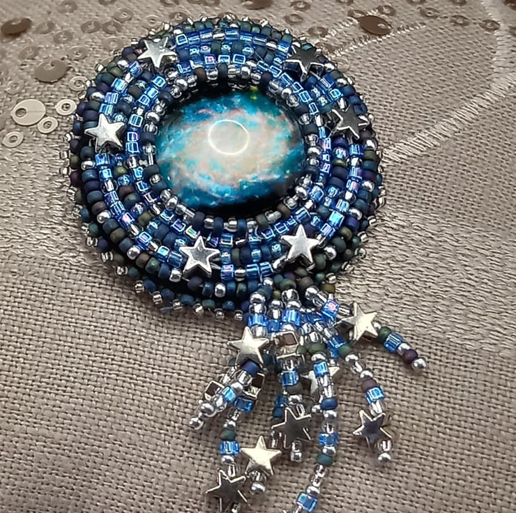 A swirling glass cabochon galaxy forms the centre of this beautiful brooch. I've then really gone to town and surrounded it with lots of bead embroidered seed and cube beads in shades of blue and silver, a sprinkling of small metal star beads and further beading to form a spray of stars. All beads are securely sewn onto bead backing and neatly backed with ultrasuede, with the metal brooch pin as the finishing touch. Brooch measures 4.2cm in diameter, with a total length of 7.2cm.