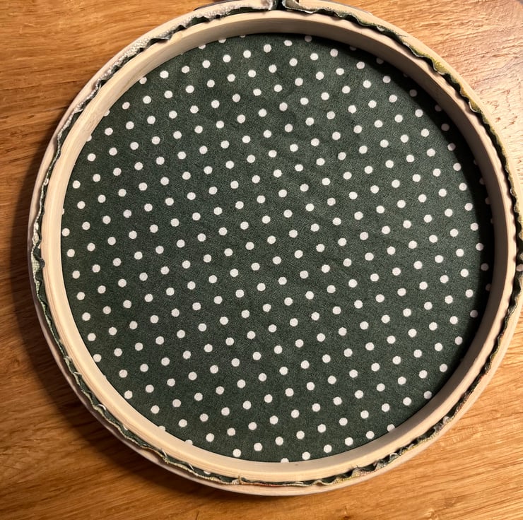 The wooden embroidery hoop measures 6 inches across, and is backed with printed cotton fabric.