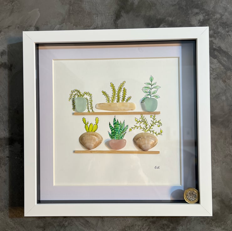 This piece is made with sea shells, sea glass and house plants painted with watercolours.