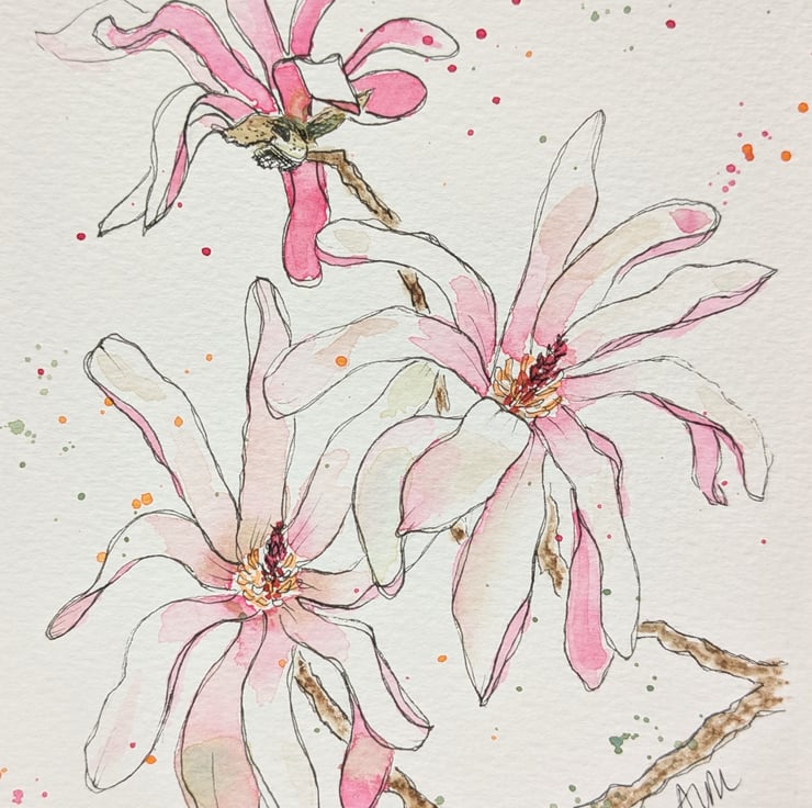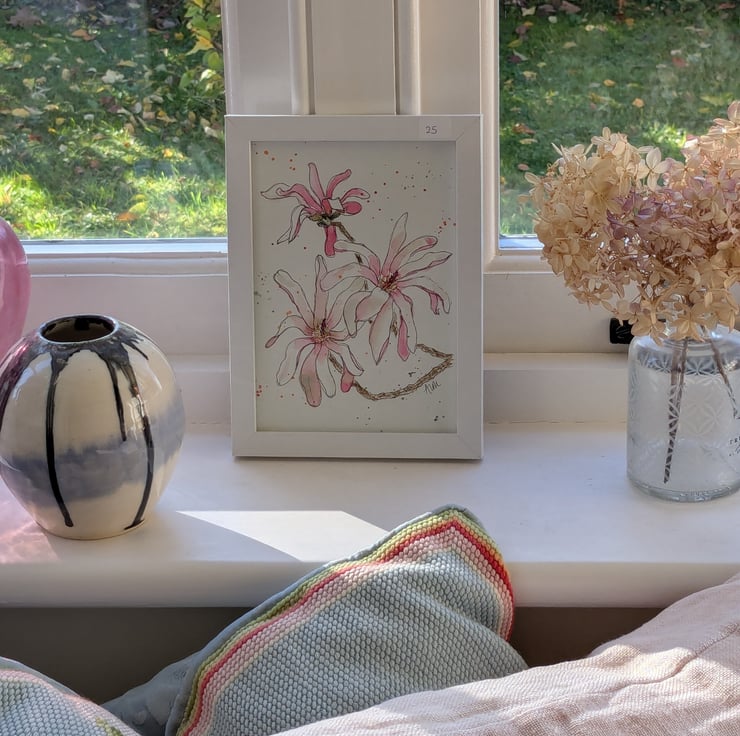 A5 original watercolour of magnolia stellata blooms presented in a simple white frame. Ink and wash.
