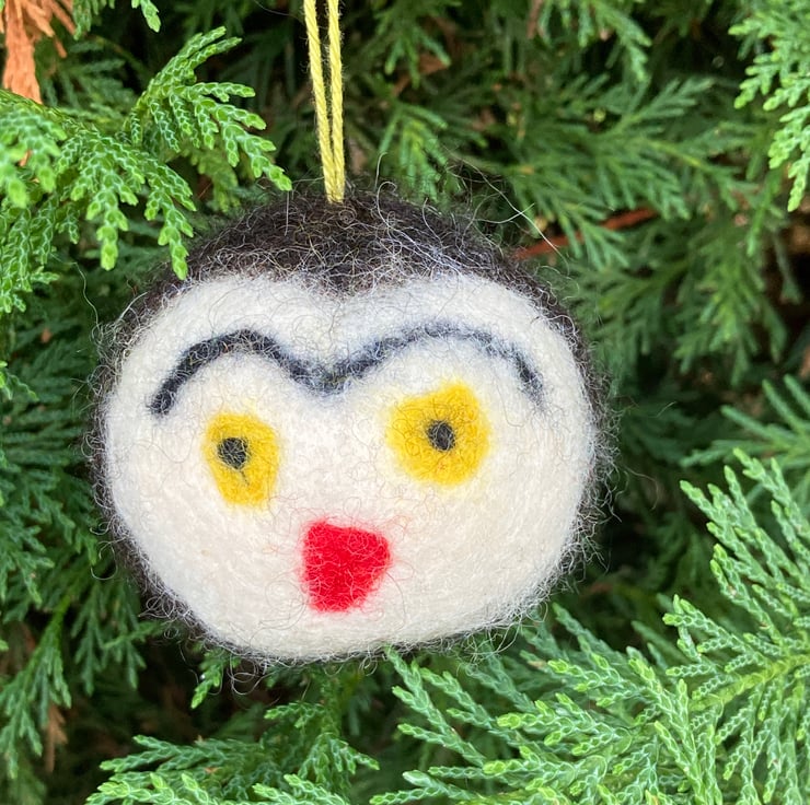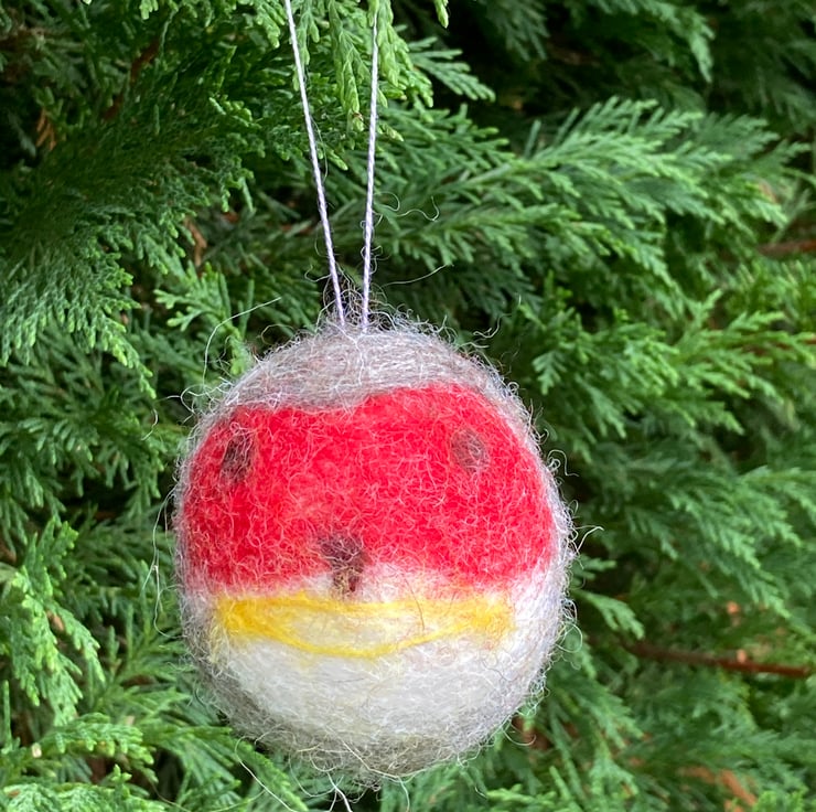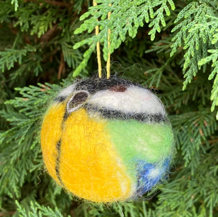 These lovely garden birds are made from a wool base ball, decorated with scraps of wool yarn and dyed fleece. The colours are needle-felted onto the wool ball and then the balls are washed in the machine to wet felt them. This makes a secure, firm ball and the decorations will last. To make these baubles we use the same method as we use for our wool tumble dryer balls. If you decide to hang the bauble on your Christmas tree, when the festive season is over you can use it in your tumble dryer to speed up the drying process and so save money on your energy bills.
