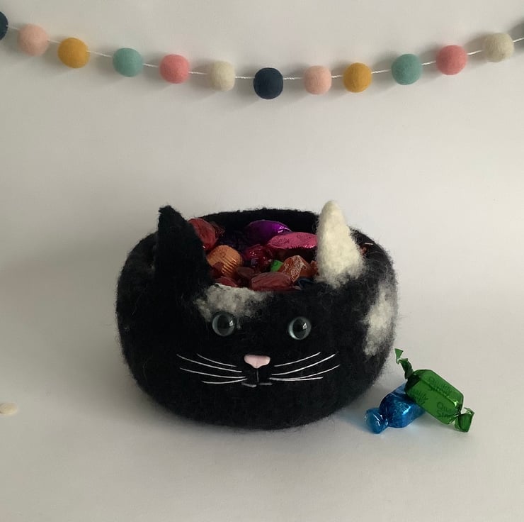 FELTED 'FUSSPOT' BOWL, desk tidy  . Cat. Black and white . Home decor.