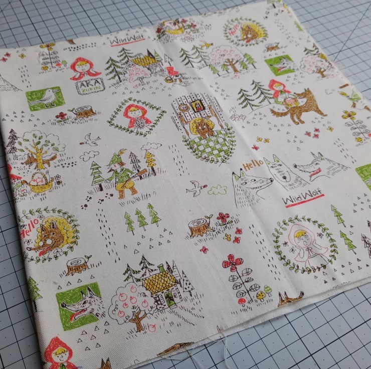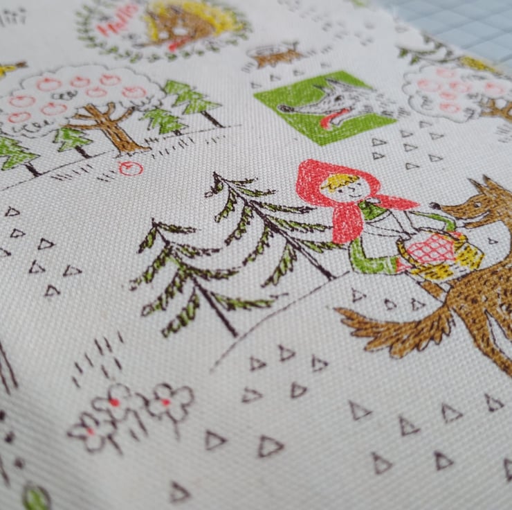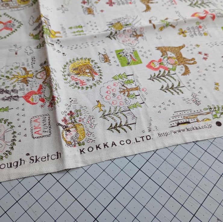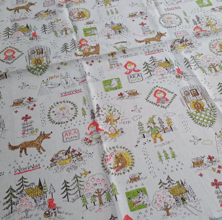 Fat quarter from Kokka depicting the fairytale Little Red Riding Hood, with the Wolf (and friends), Grandma's Cottage, the hunter (instead of a woodcutter). Plus trees, apples, birds and text, including WILD WOLF and AKA ZUKIN - the Japanese name for the Red Riding Hood story.