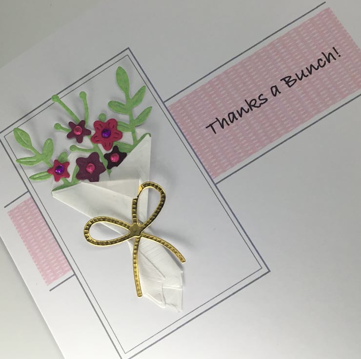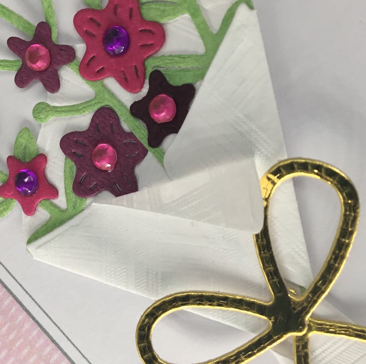 A handmade card featuring a hand die cut bouquet of flowers on a printed pink background strip. The flowers and foliage are cut from various colours of high quality card. The bouquet wrapper is created by folding double sided, patterned paper. The bouquet is further embellished with gems in the centre of each flower and a gold mirror card bow.
