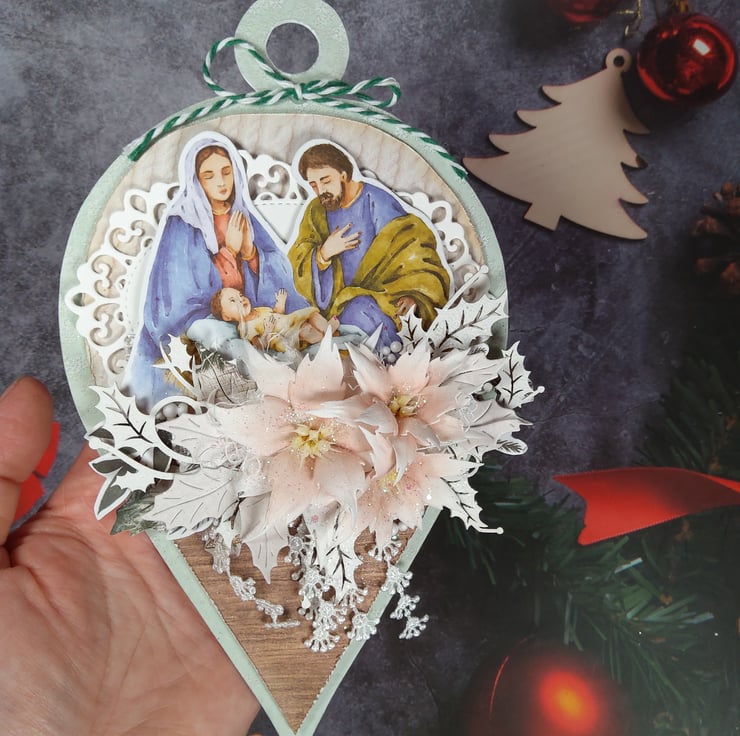 Celebrate the true spirit of Christmas with this handcrafted Nativity ornament, filled with elegance, warmth, and meaning. The ornament presents a beautiful scene of the Holy Family surrounded by delicate paper poinsettias, frosty leaves, and shimmering details that gently reflect the light.