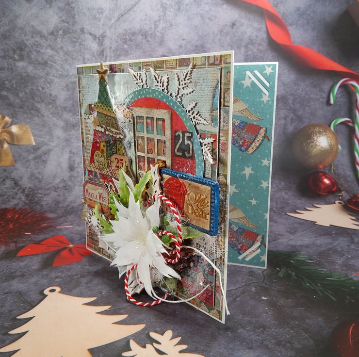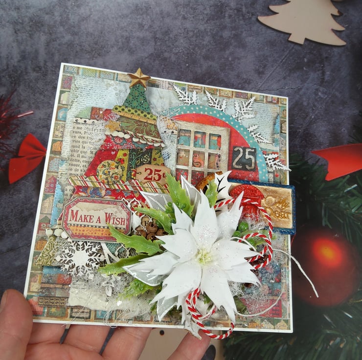 Add a touch of festive magic to your Christmas greetings with this handmade layered card, beautifully designed in traditional holiday colours. The composition features a vintage-style Christmas tree, festive details, and a bold “Make a Wish” sentiment at the centre. A stunning handcrafted white poinsettia surrounded by frosty greenery, twine, and delicate snowflake accents completes the look.