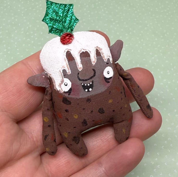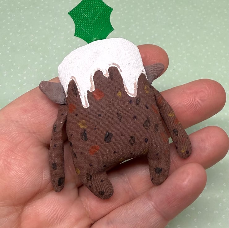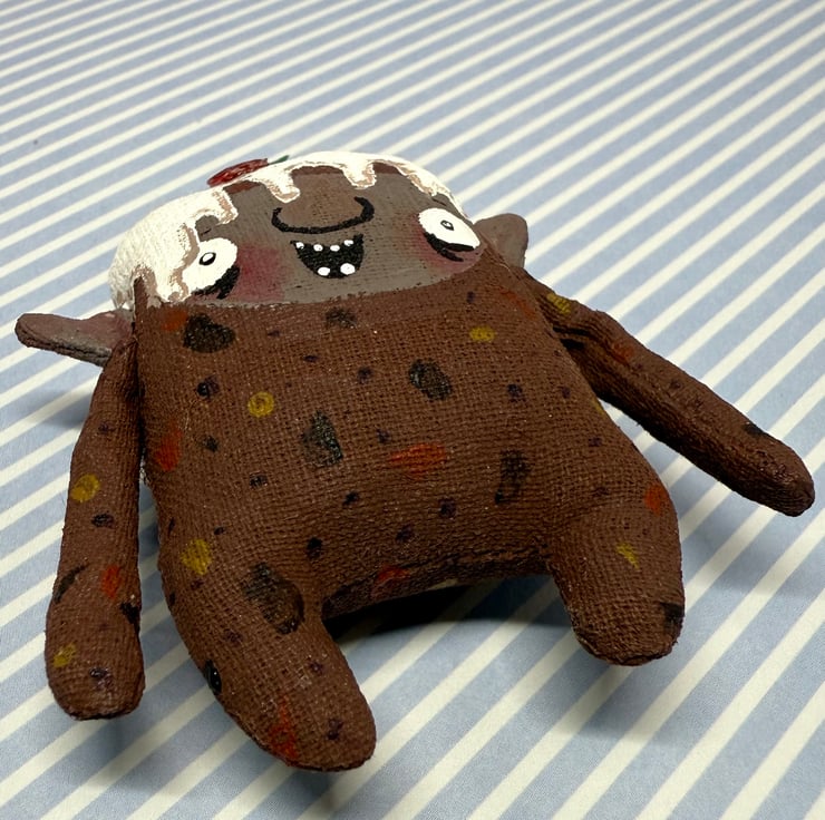 Hand painted cotton miniature cotton doll. This doll is topped with metallic shine holly leaf and berry. The paintwork depicts the rich sponge with fruity chunks and drippy icing topping. The doll is entirely hand painted.