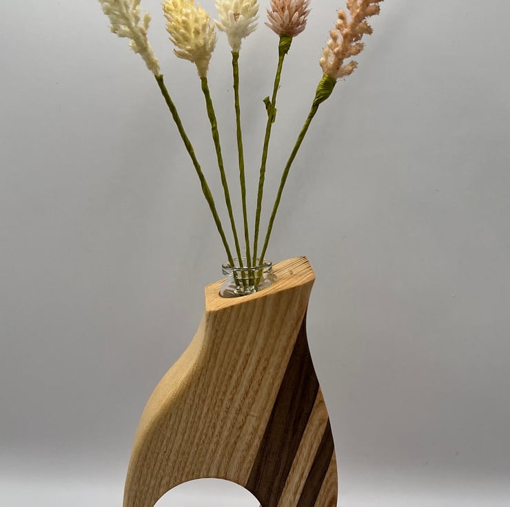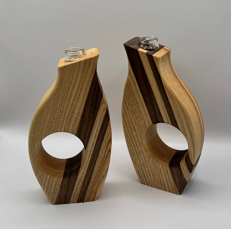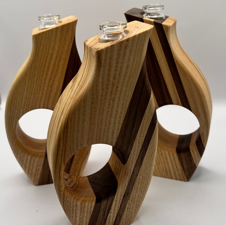 Bring natural charm and modern elegance to your space with these handcrafted wooden thumb vases. Made from Ash and Walnut, each vase showcases the beauty and character of the wood in a stylish form.