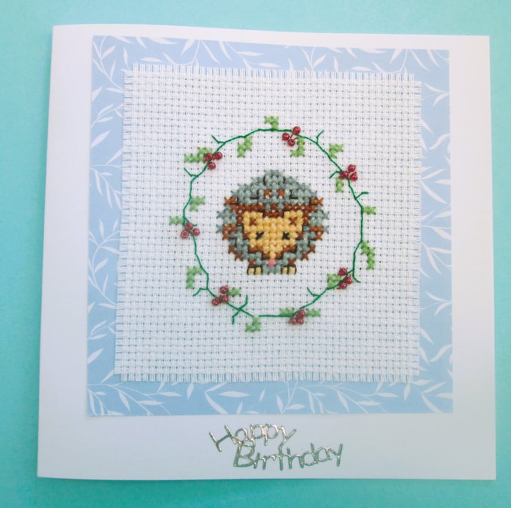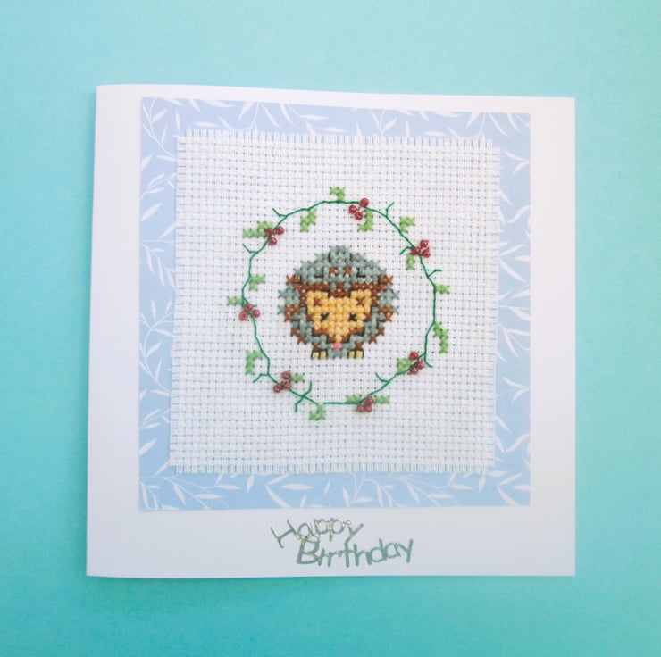 Such a cute hedgehog cross stitch birthday card, mounted onto pretty craft paper and then onto a square card which is blank inside for your special birthday message. I have used tiny glass red beads for the berries.