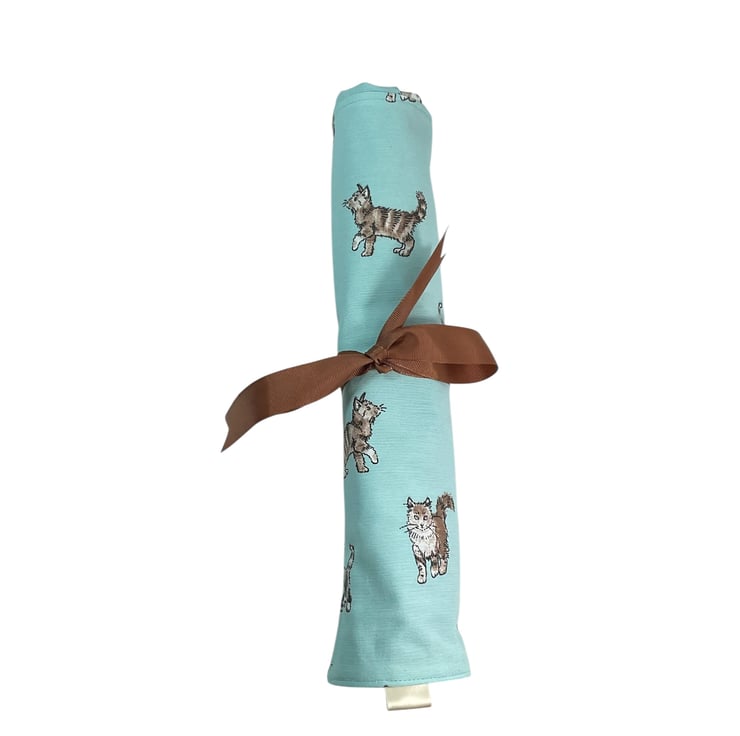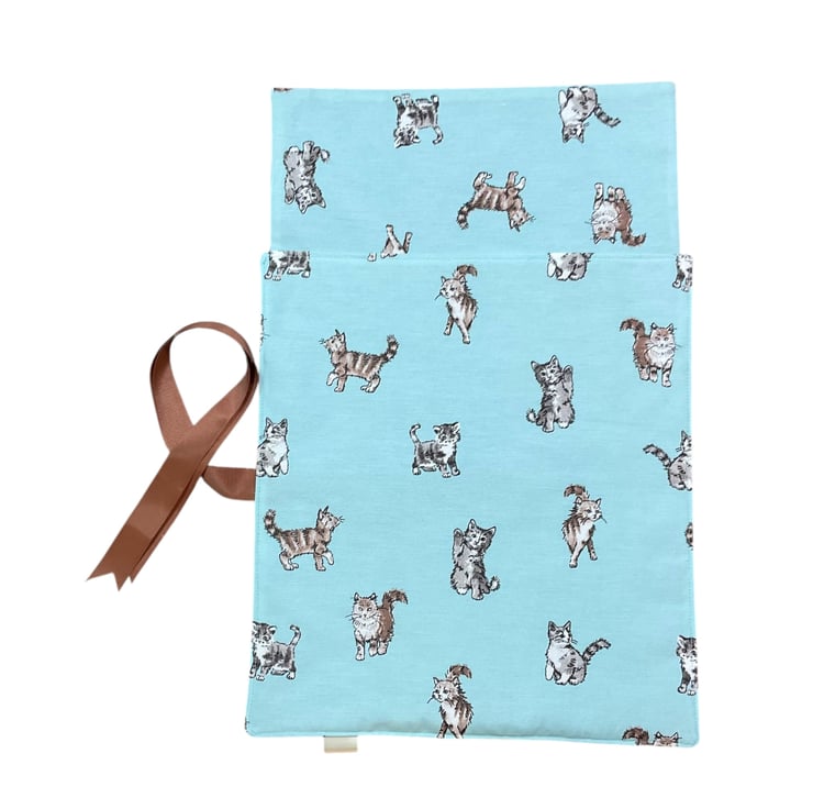 The case is in the cutest grey and chocolate tabby cat print cotton on a light turquoise background paired with a darker turquoise cotton canvas .