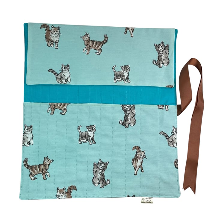 The case itself is interfaced for sturdiness and has 2 pockets, the lower pocket houses 13 sets of needles and above in the plain pocket is space for 13 more. There is a deep flap with matching fabrics and the entire case is topstitched for neatness. The case rolls up and is fastened by chocolate brown grosgrain ribbon. needles not included in sale. Pattern placement may vary.