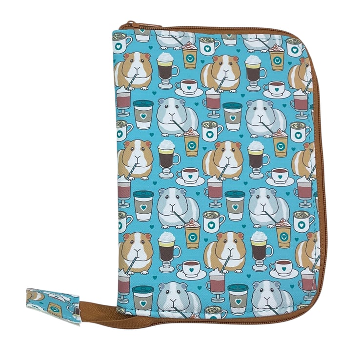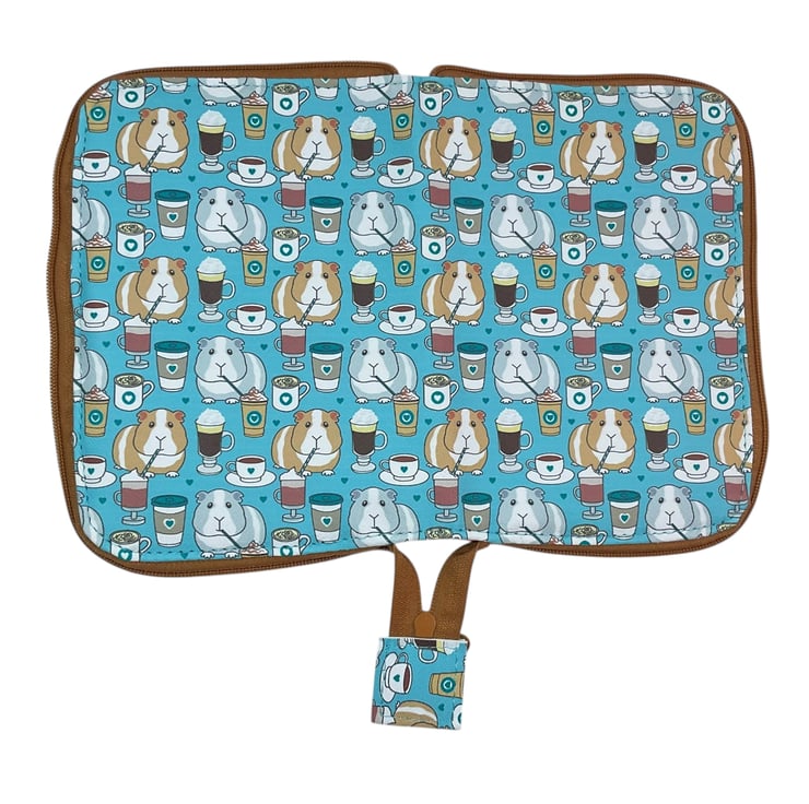 The case is made in the cutest guinea pig and coffee cups patterned faux leather fabric on a turquoise background. I have fully lined the case in a red water resistant canvas. On the opposite side is a generously sized zip pocket that will easily hold several cables.