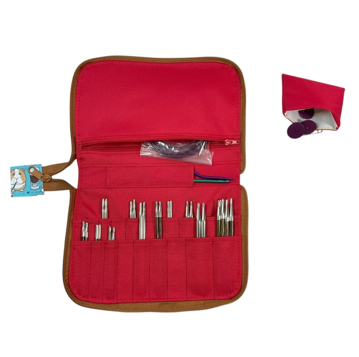 This good sized case holds 17 or more sets of needles, the lower pocket can hold the shorter length 10cm (4" ) needles and both pockets are able hold up to 13cm (5") in length. The slots are offset so needles sit comfortably in front of each other. The slots differ in sizes to accommodate 2.75mm (US 2) or smaller right up to 10mm (US 15) This case also works well for the shorter 12cm double pointed needles, this along with the video are demonstrated in alternate colour cases.