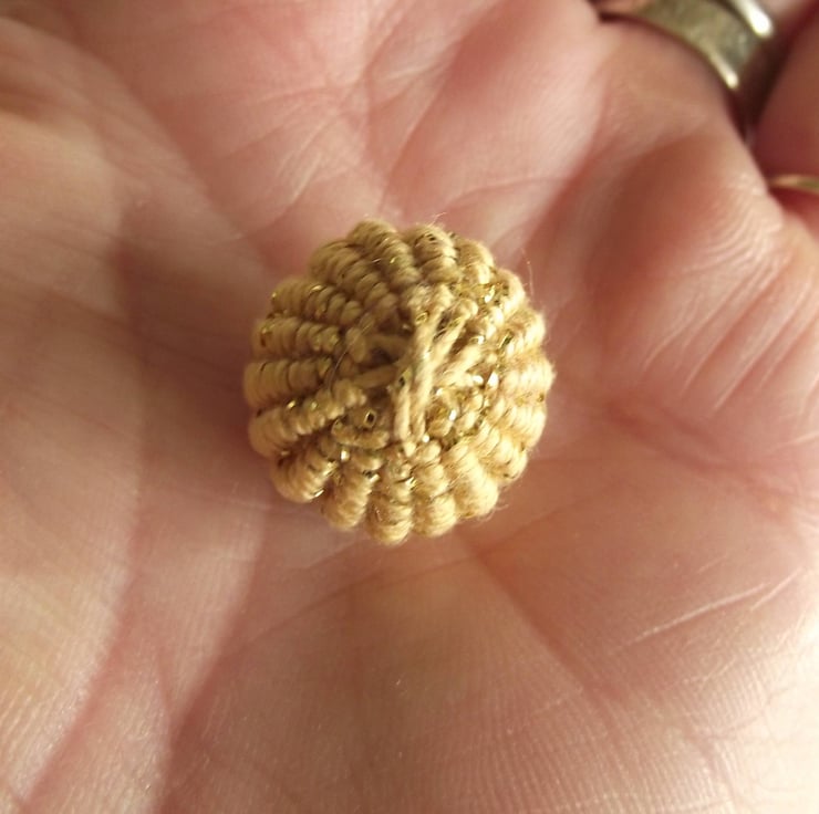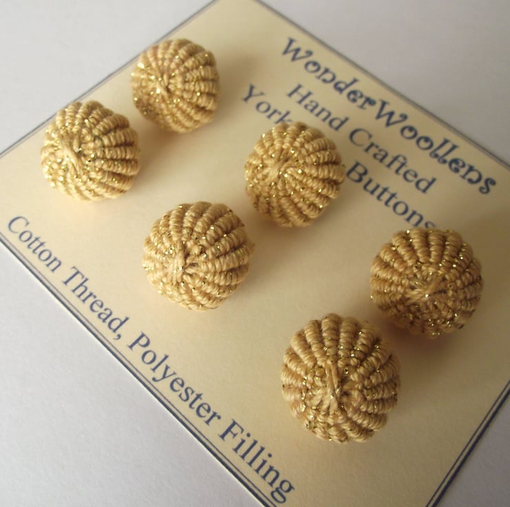 This listing is for a set of six spherical gold buttons, which have been intricately crafted using a thread which consists of one ply of gold coloured cotton thread and one ply of shiny gold lurex thread. They are stuffed with safe polyester stuffing. They have integral shanks for ease of attaching to clothes, bags etc. As well as being used as functional buttons, they could be used as embellishments. Ideal for re-enactors.