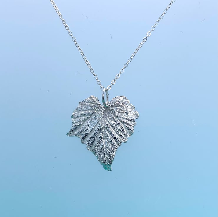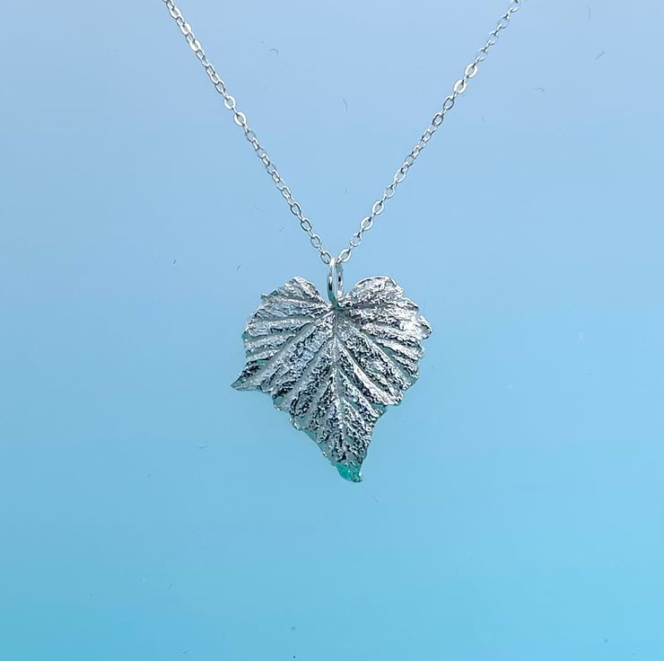 The leaf is 25 x 25 mm and hangs from an adjustable 16-18” sterling silver chain.