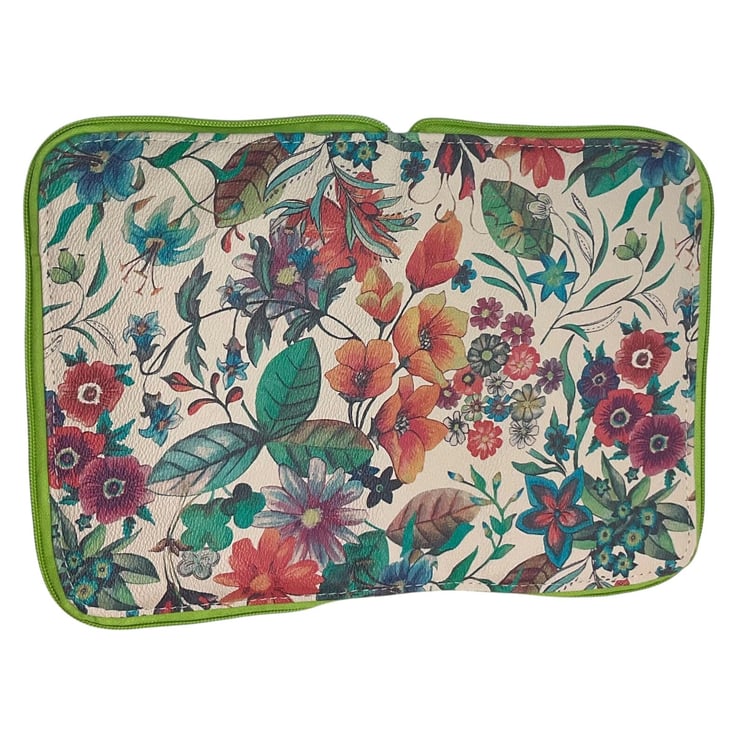 The case is made in gorgeous floral print patterned faux leather fabric on an ecru background. I have fully lined the case in a lime green water resistant canvas. On the opposite side is a generously sized zip pocket that will easily hold several cables.