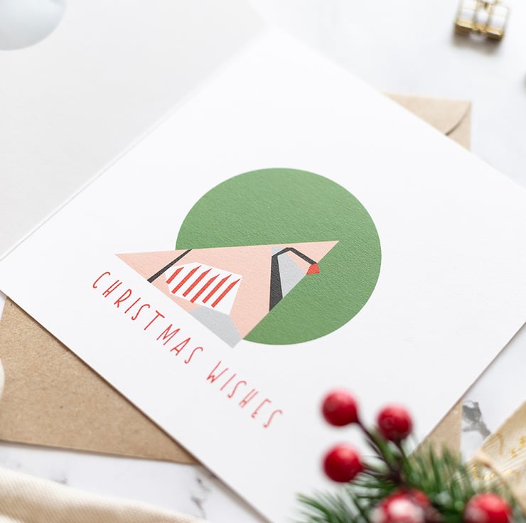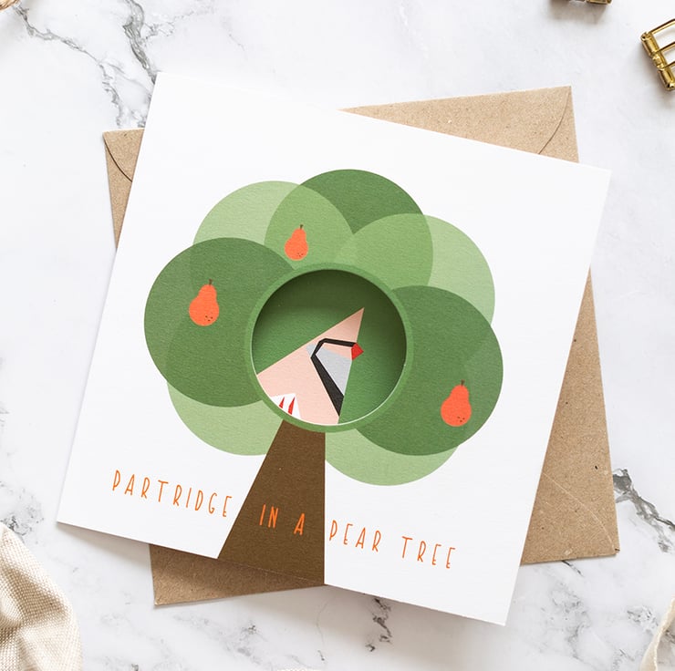 This festive card features an illustration from the 12 days of Christmas - Day 1 - A Partridge in a Pear Tree. A square 15 x 15 cm card with aperture cutout to reveal part of the geometric bird design. The inside has an image in addition to 'Christmas Wishes'. Printed onto 300gsm card stock paired with a Kraft Envelope