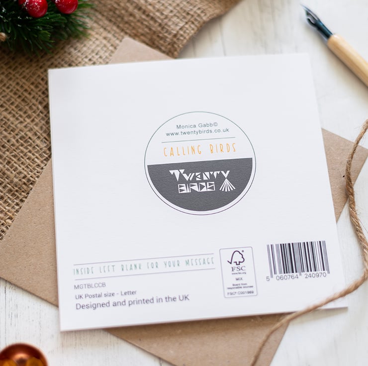 This is day 4 of the twelve days of Christmas - Four Calling Birds. This square 15 x 15 cm card with Four geometric Robin - bird design, surrounded by festive Holly. The outside reads '4 Calling Birds' The inside is left blank for your message. 300gsm recycled card stock paired with a Kraft Envelope.