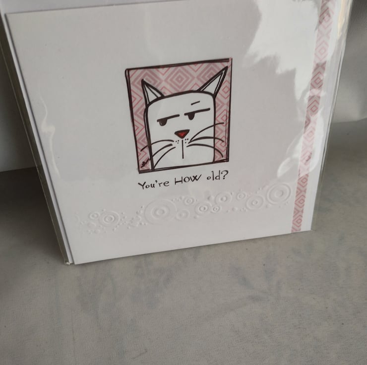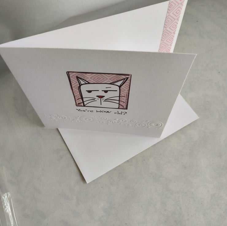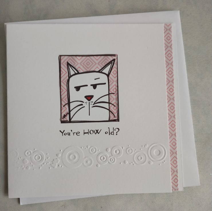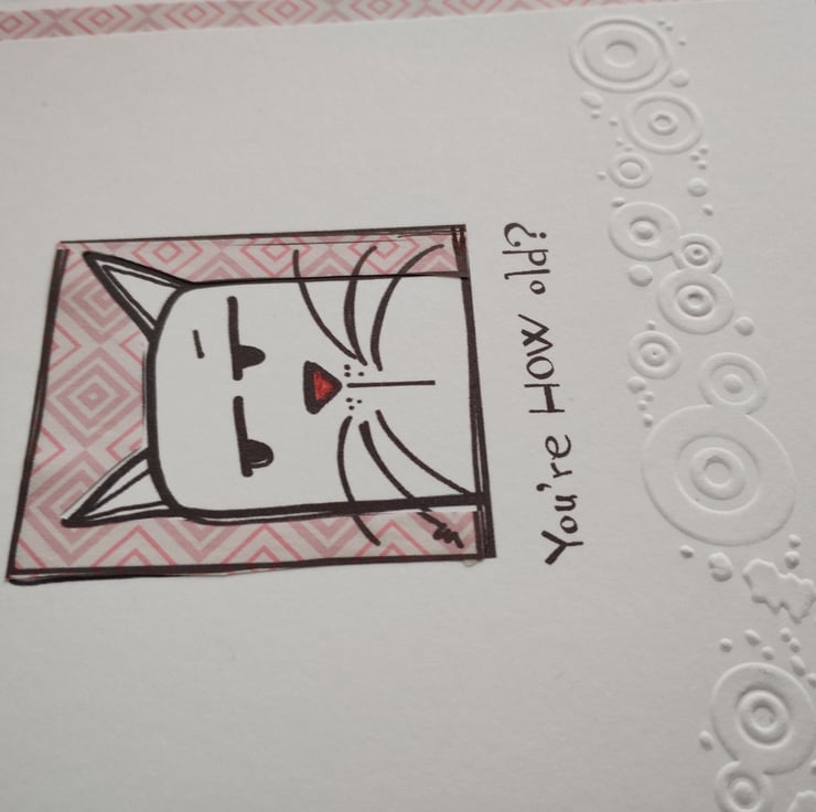 I've printed the image of the cat and then printed again to paper piece the background in a pink geometric patterned paper. The nose is coloured with a subtle pearl finish ink. The wording 'You're HOW old' is printed in a quirky script.